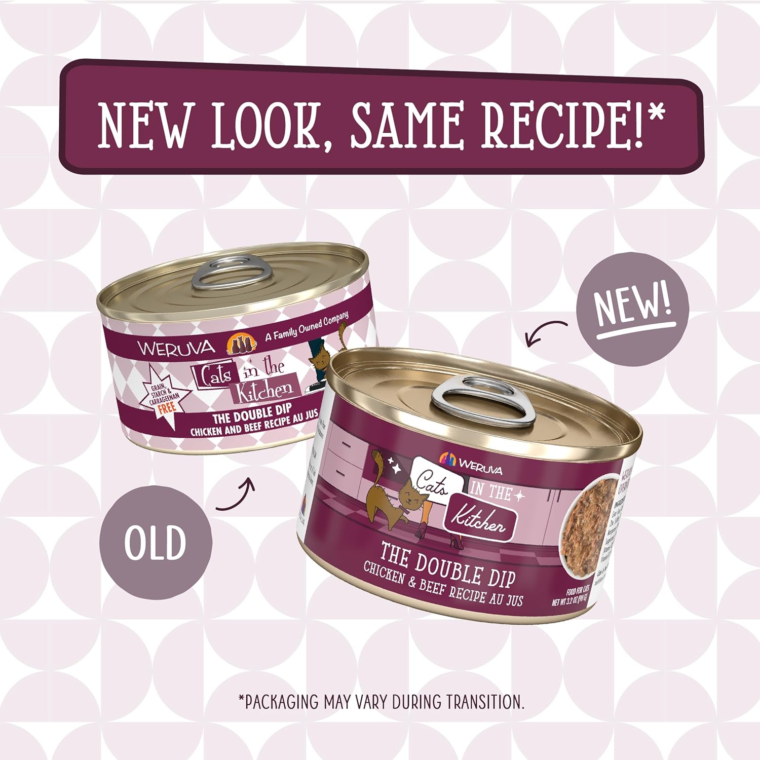 - The Double Dip (3.2oz cans, pack of 24) Featuring cage-free shredded chicken and grass fed beef in a delicious Au Jus. An all natural blend of premium proteins that cat’s can't resist!