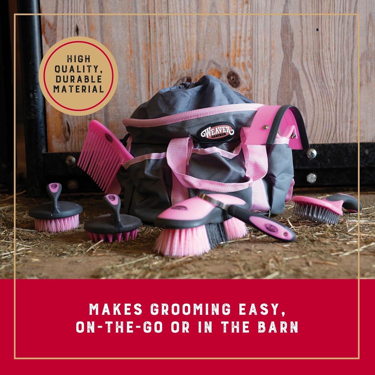 - 7-Piece Grooming Kit: Weaver Equine’s grooming kit for horses meets all your equine grooming needs; the horse care kit includes a comb, hoof pick, palm-held curry comb, face brush, mane and tail brush, dandy brush, and sweat scraper/coarse curry combo