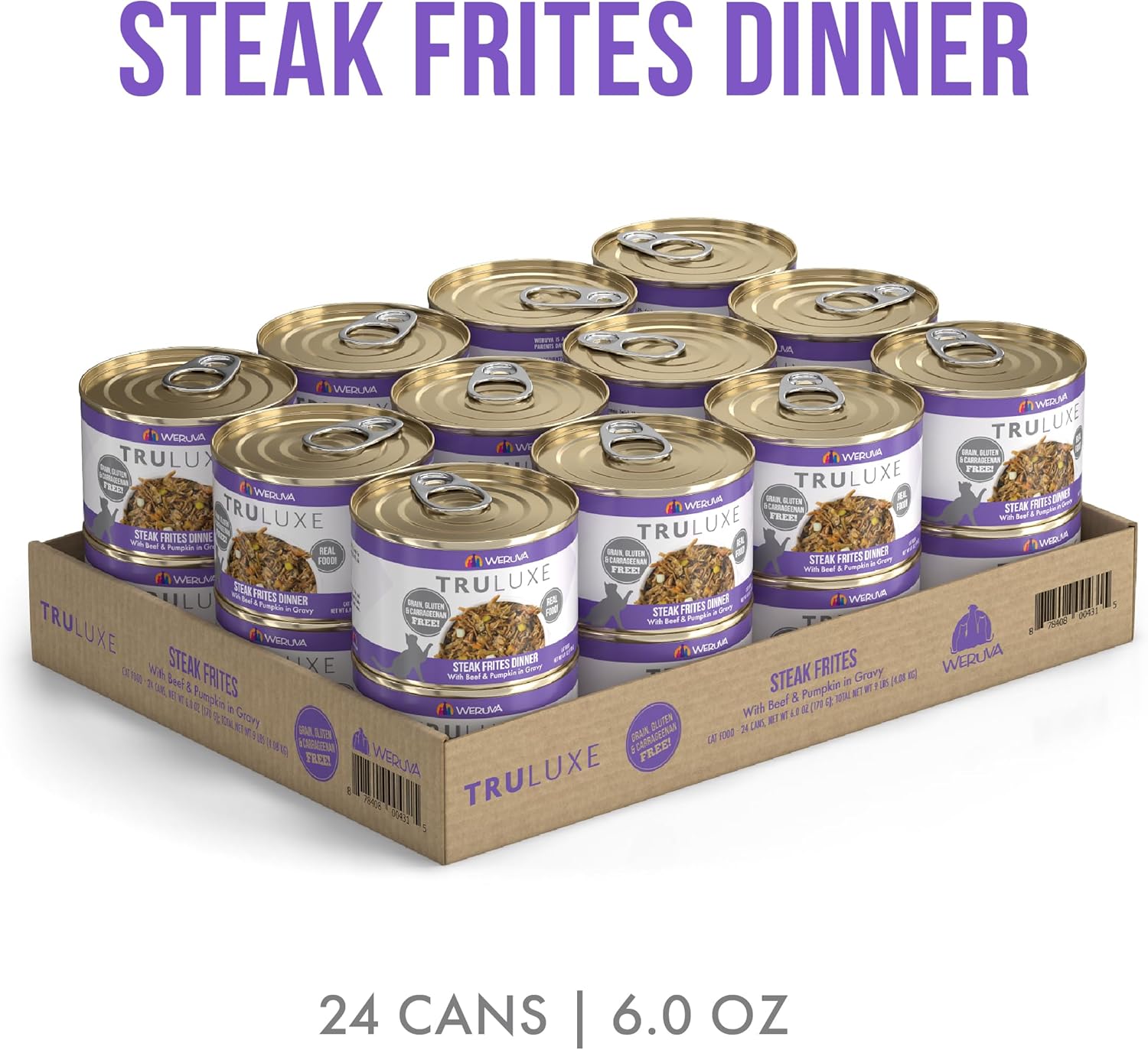 - Steak Frites Dinner (6oz Can, Pack of 24) Chunks of grass-fed beef, carrots, pumpkin, and sweet potato in gravy.