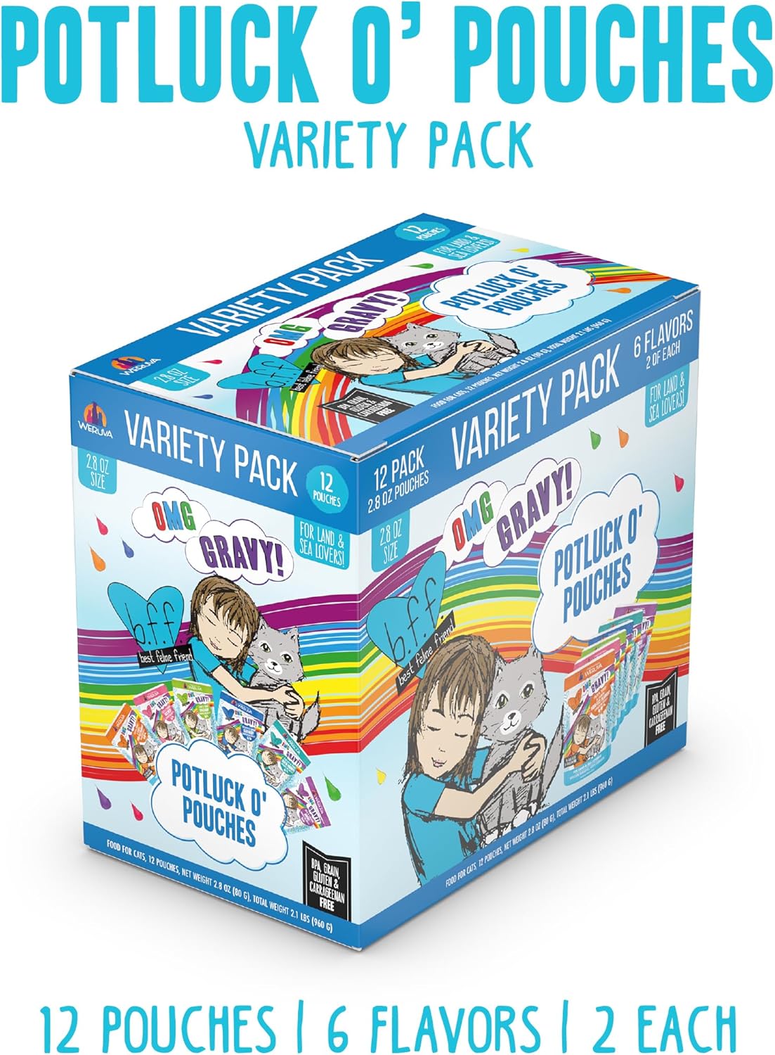 - Potluck O' Pouches Variety Pack (2.8oz Pouches, Pack of 12) OMG, Six different flavors in one variety pack! Featuring premium proteins like tuna, chicken, salmon, beef, lamb and duck in a tasty gravy.