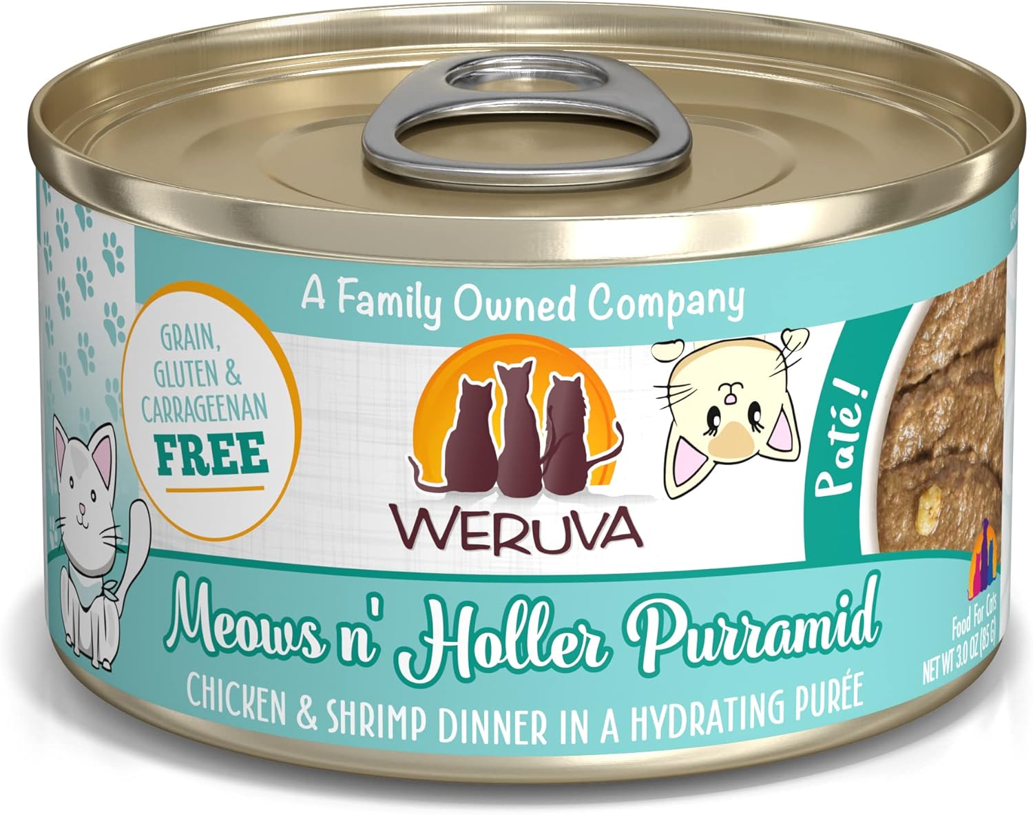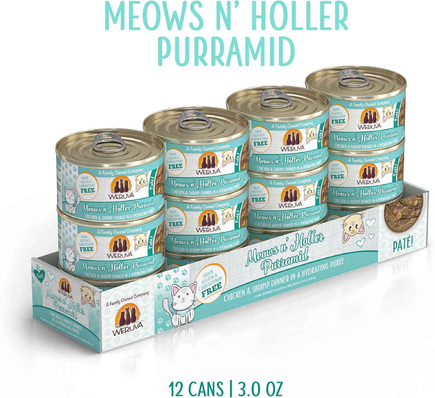 - Meows n Holler PurrAmid cage free, boneless, skinless white meat chicken and shrimp pureed into a creamy pate