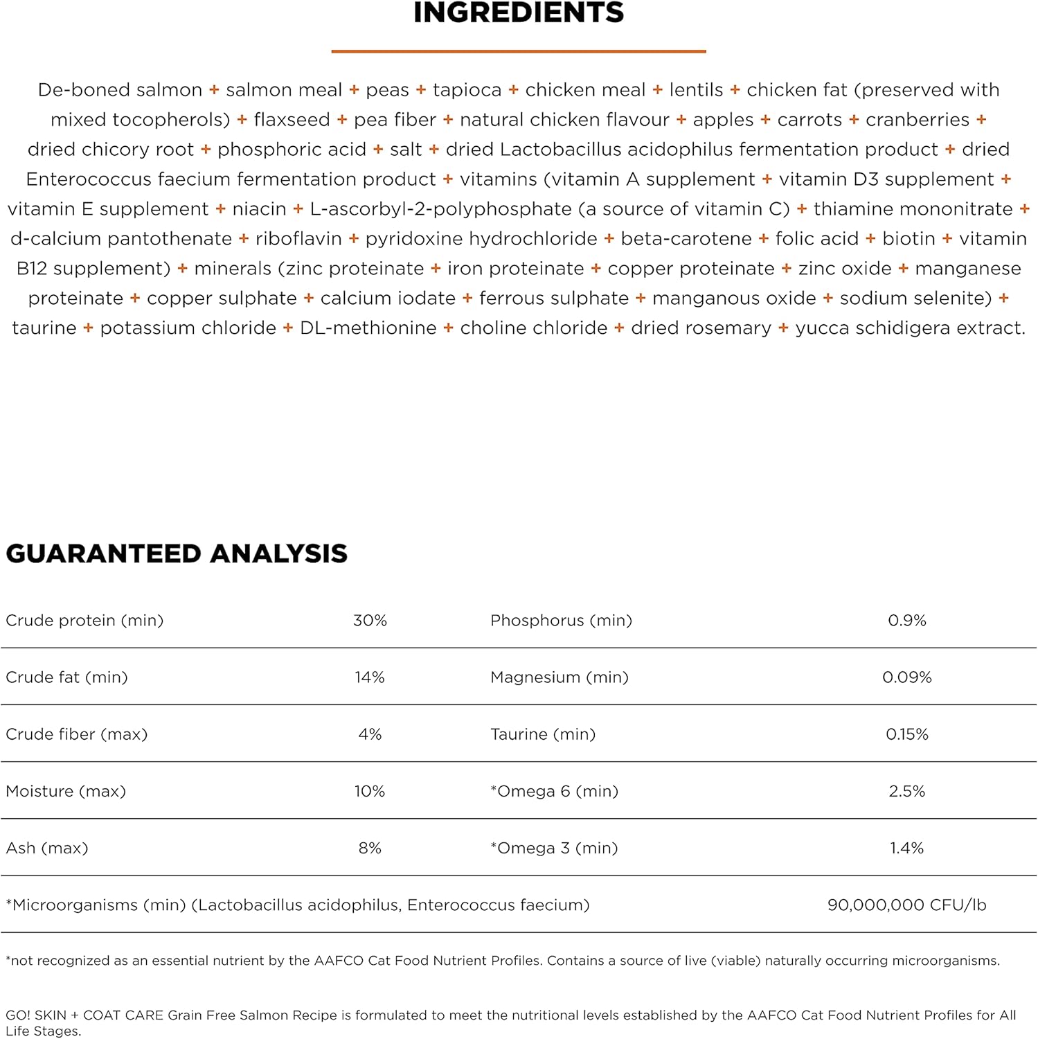 • DESIGNED FOR INDOOR CATS: Our GO! SOLUTIONS SKIN + COAT CARE Salmon Recipe is a premium-quality indoor cat food formulated with balanced proteins + fats to support a healthy weight.