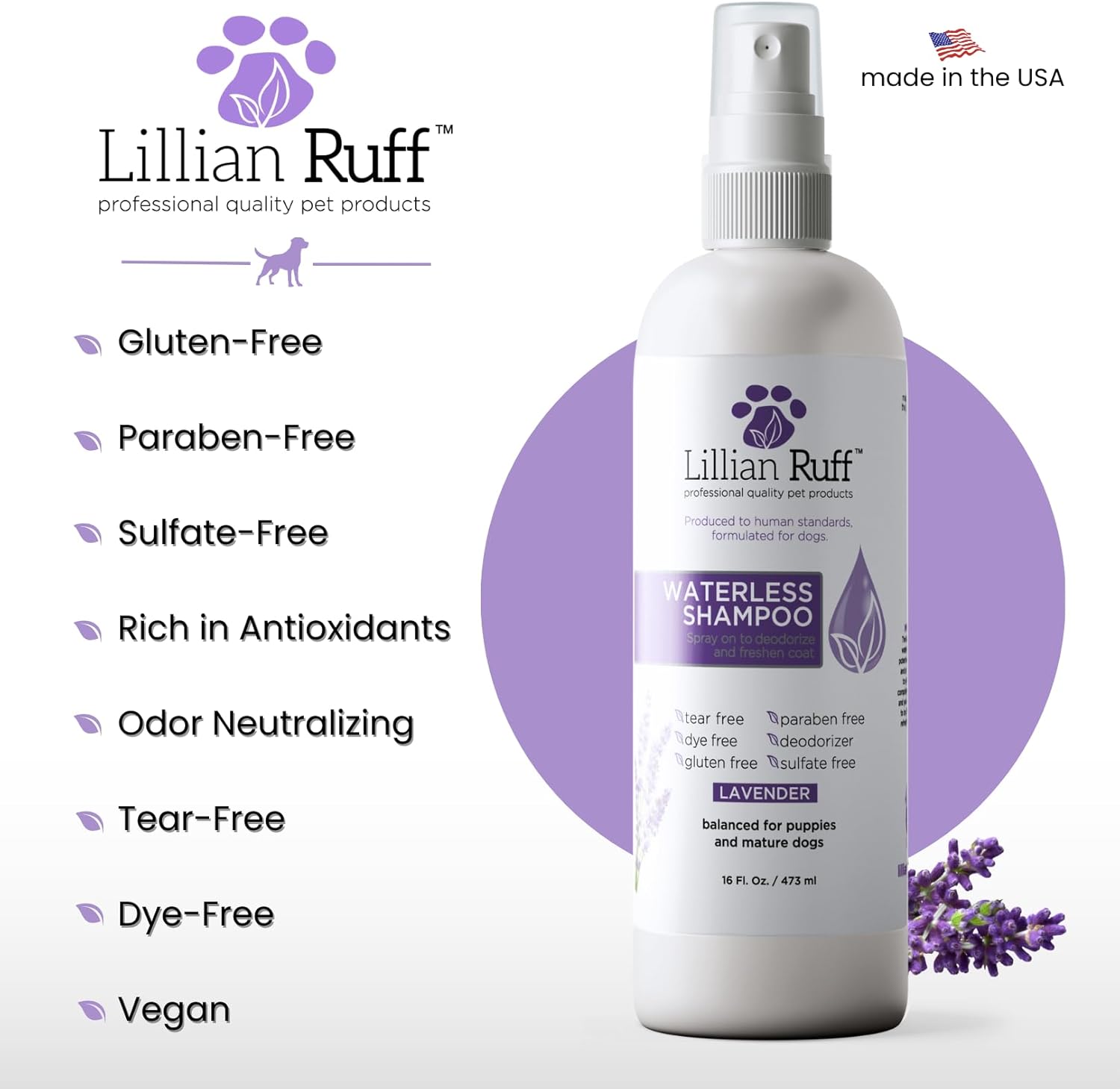 - Safe and Gentle Formulation: Prioritizing your pet's well-being, our Waterless pet shampoo is gentle yet effective. Enriched with Aloe, it is suitable for animals with sensitivities. Tough on dirt and smells, yet gentle on the skin, our Lillian Ruff Waterless Shampoo spray-on dry shampoos provide a comfortable and refreshing grooming experience.
