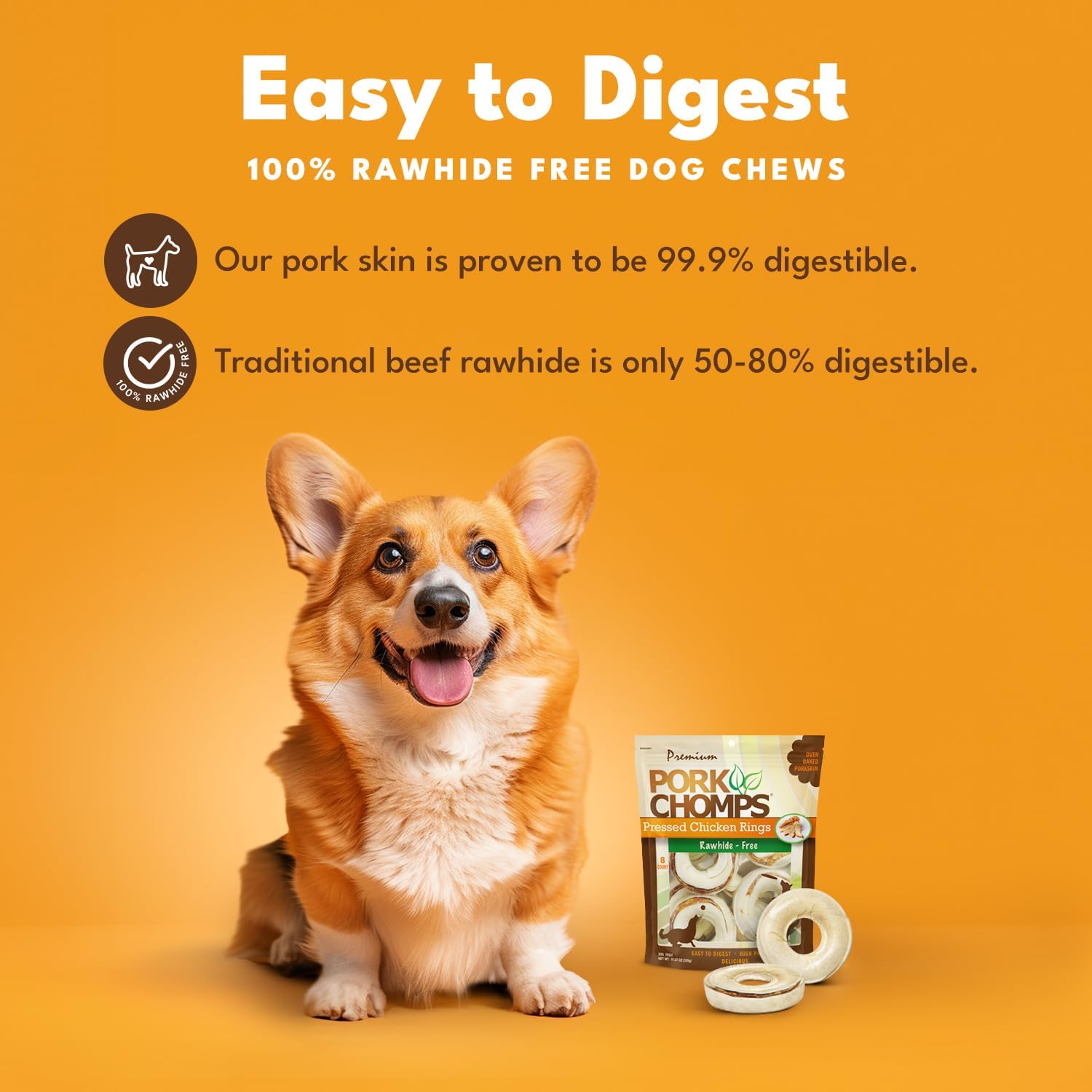 - 100% Rawhide Free Dog Chews - Pork Chomps oven baked pork skin is long lasting, low fat, & naturally delicious.