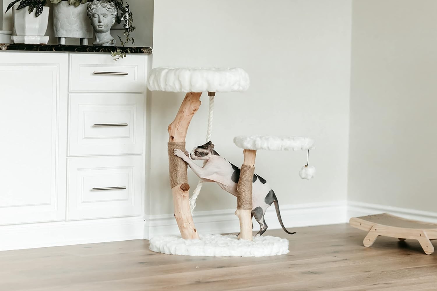 - BEAUTIFUL & UNIQUE DESIGN: Unlike most cat furniture, this wooden cat tree tower will enhance the look of your home. It includes two beautifully crafted, one of a kind trunks that hold a faux fur covered platform and an extremely comfortable bolstered bed. It is perfect for your kitty to have a glorious time napping while you can enjoy looking at a beautiful piece of art that adds to your homes aesthetics.