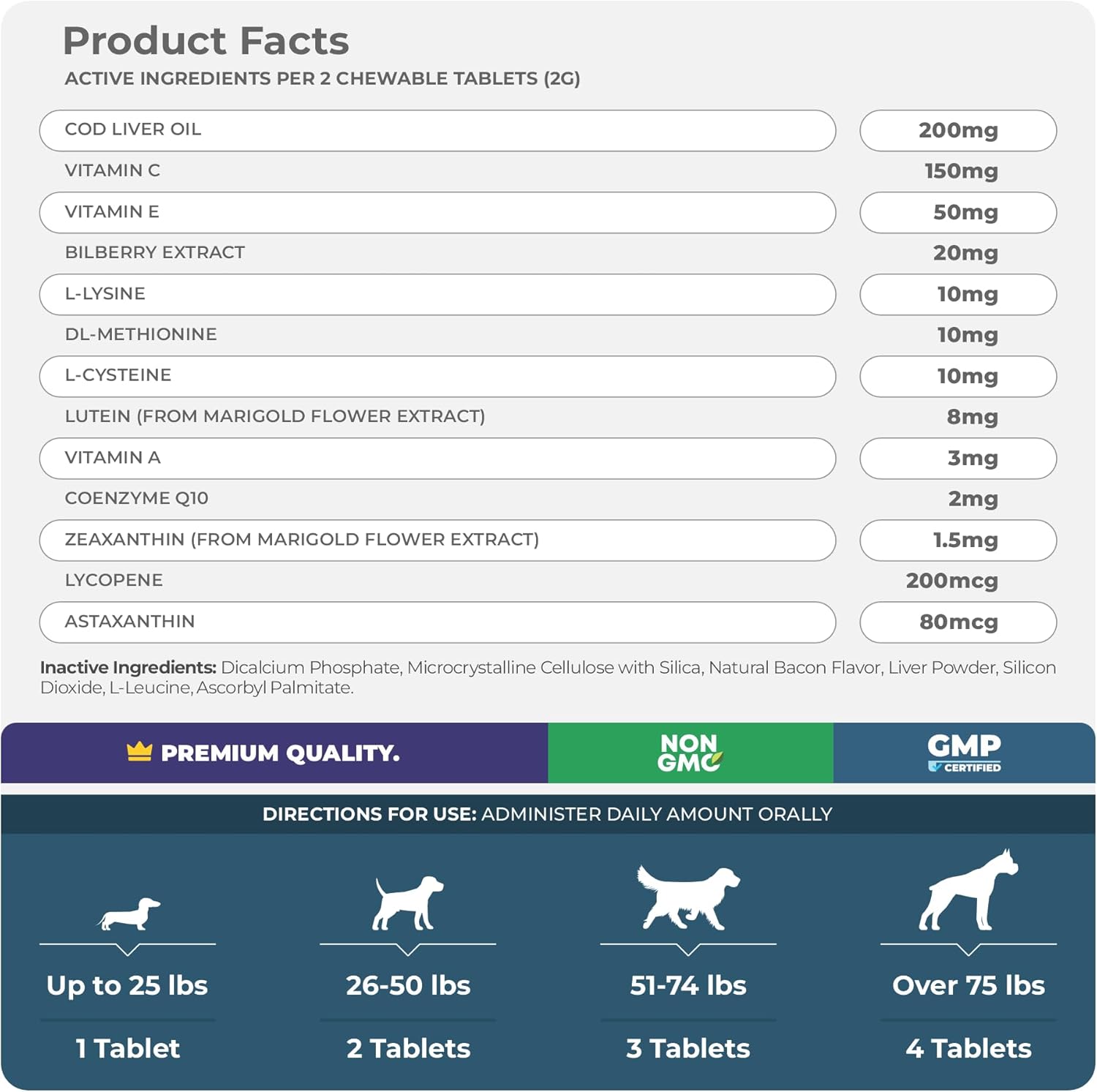 - Eye Function Dog Vitamins - Our formula has ingredients like Cod Liver Oil, Bilberry Fruit, Astaxanthin, Vitamins C and E to help support overall eye function.