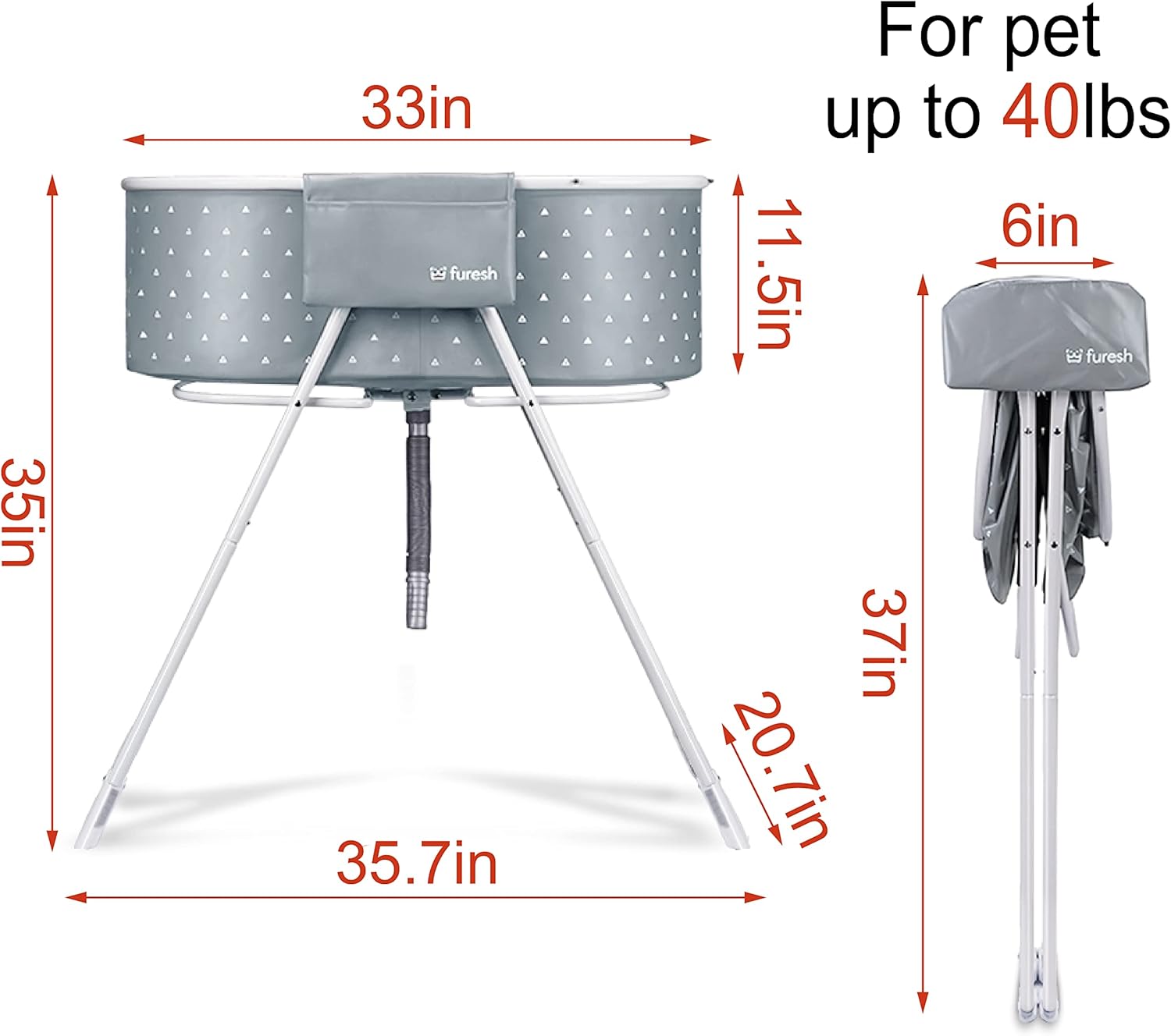 - LIGHTWEIGHT&DURABLE DESIGN: The basin is made of marine grade PVC, which is rugged, easy-to-clean,and resistant to wear from paws and claws.The frame is made of stainless aluminum tubing and weighs less than 11 lbs total, yet supports more than 130 lbs (including water) and remains steady and safe during bathing and grooming. Dimensions:35.7"L x 20.7"W x 35"H(unfolded); 2 year manufacturer warranty