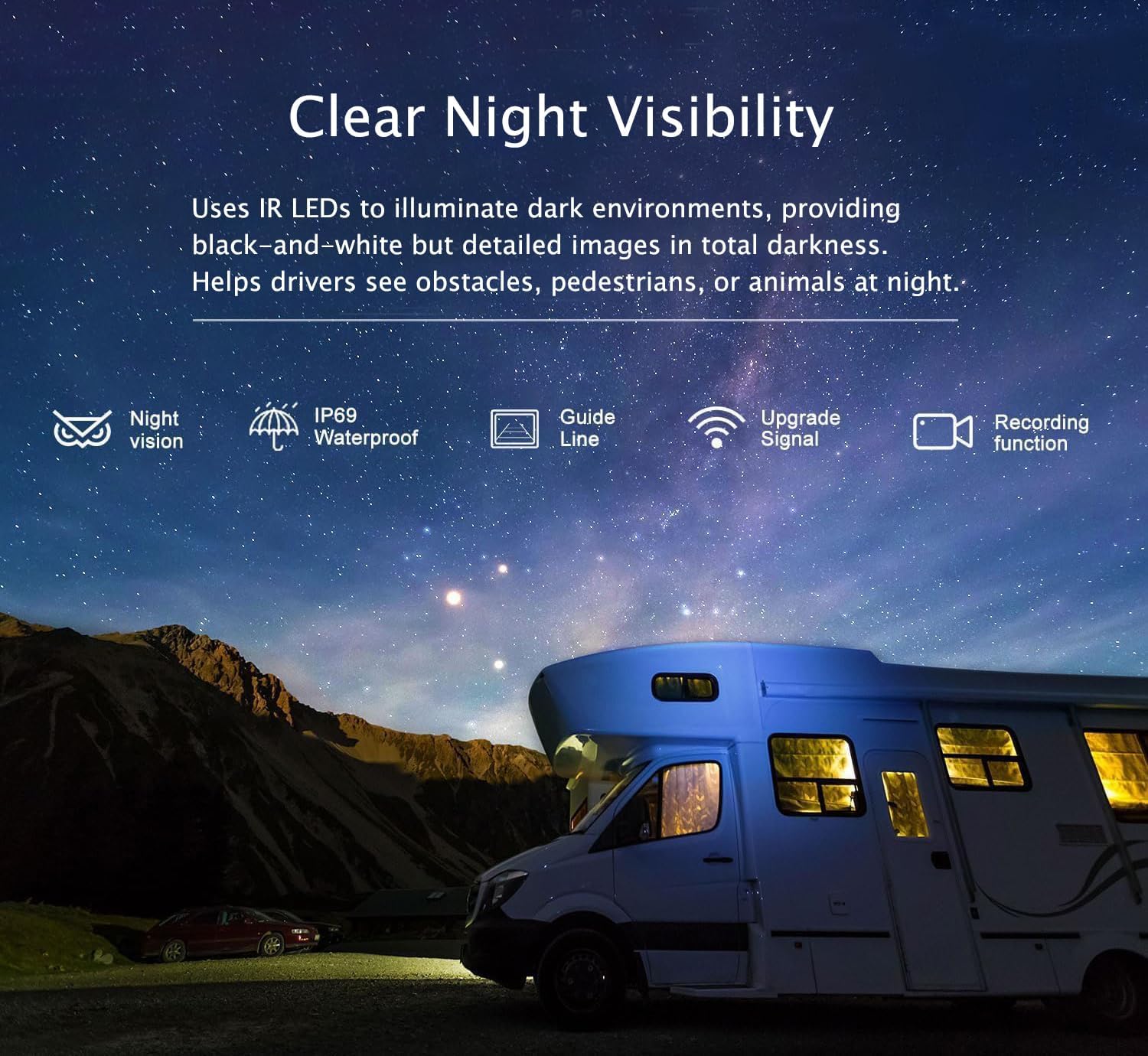 - ☆【Night Vision & IP69 Waterproof】 Equipped with infrared illumination and a high-sensitivity CMOS sensor, this rear view camera delivers exceptional night vision capability - clearly identifying obstacles, pedestrians, or animals at night. The metal-sealed, IP69 waterproof housing ensures reliable performance in rain, snow, and fog, providing real-time monitoring protection for your vehicle.