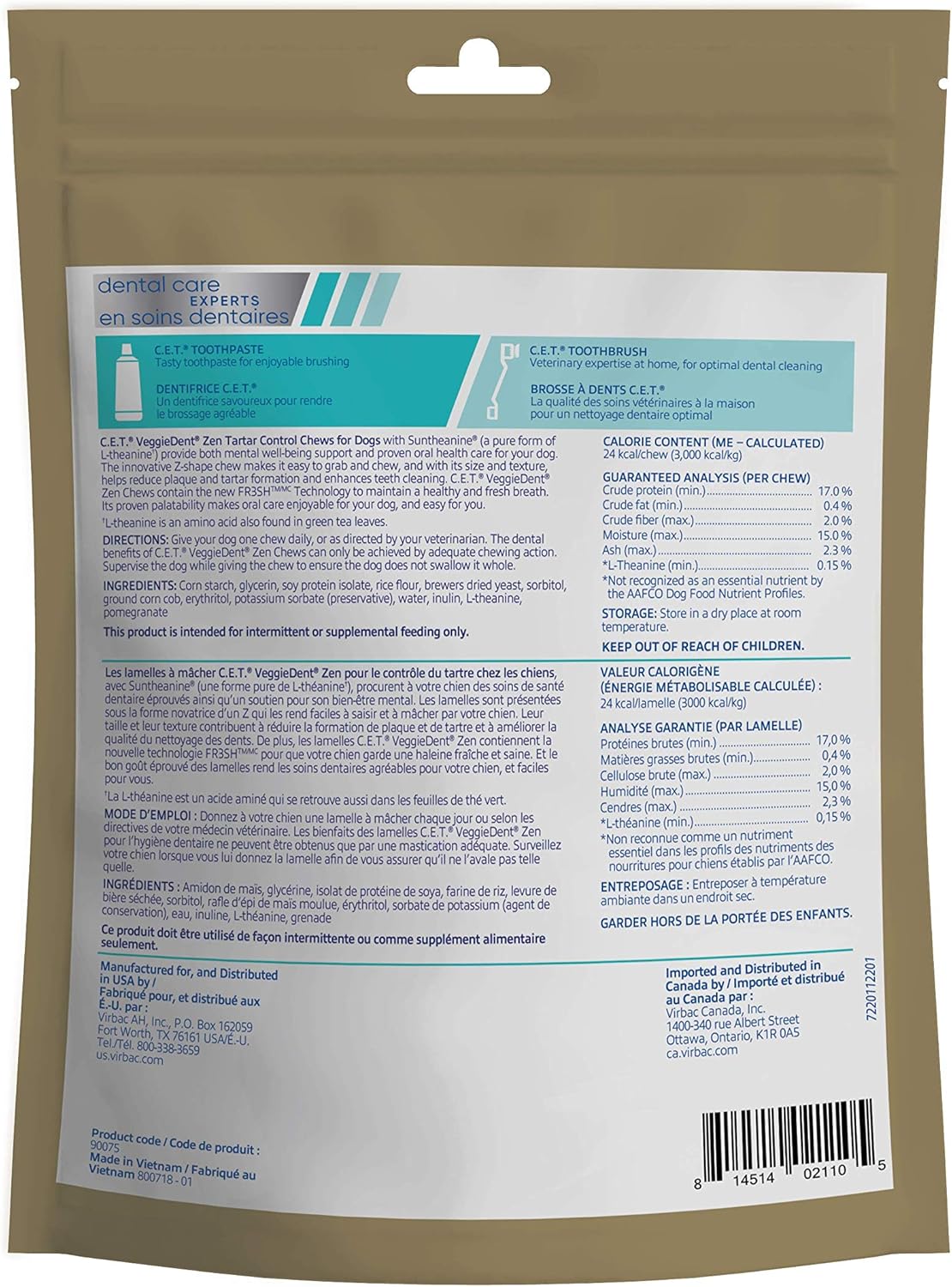- FORMULATED WITH L-THEANINE: which is also found in green tea L-theanine used in VEGGIEDENT Zen Tartar Control Chews for Dogs comes from Suntheanine, which contains a pure form of L-theanine. Suntheanine is a registered trademark of Taiyo International, Inc.