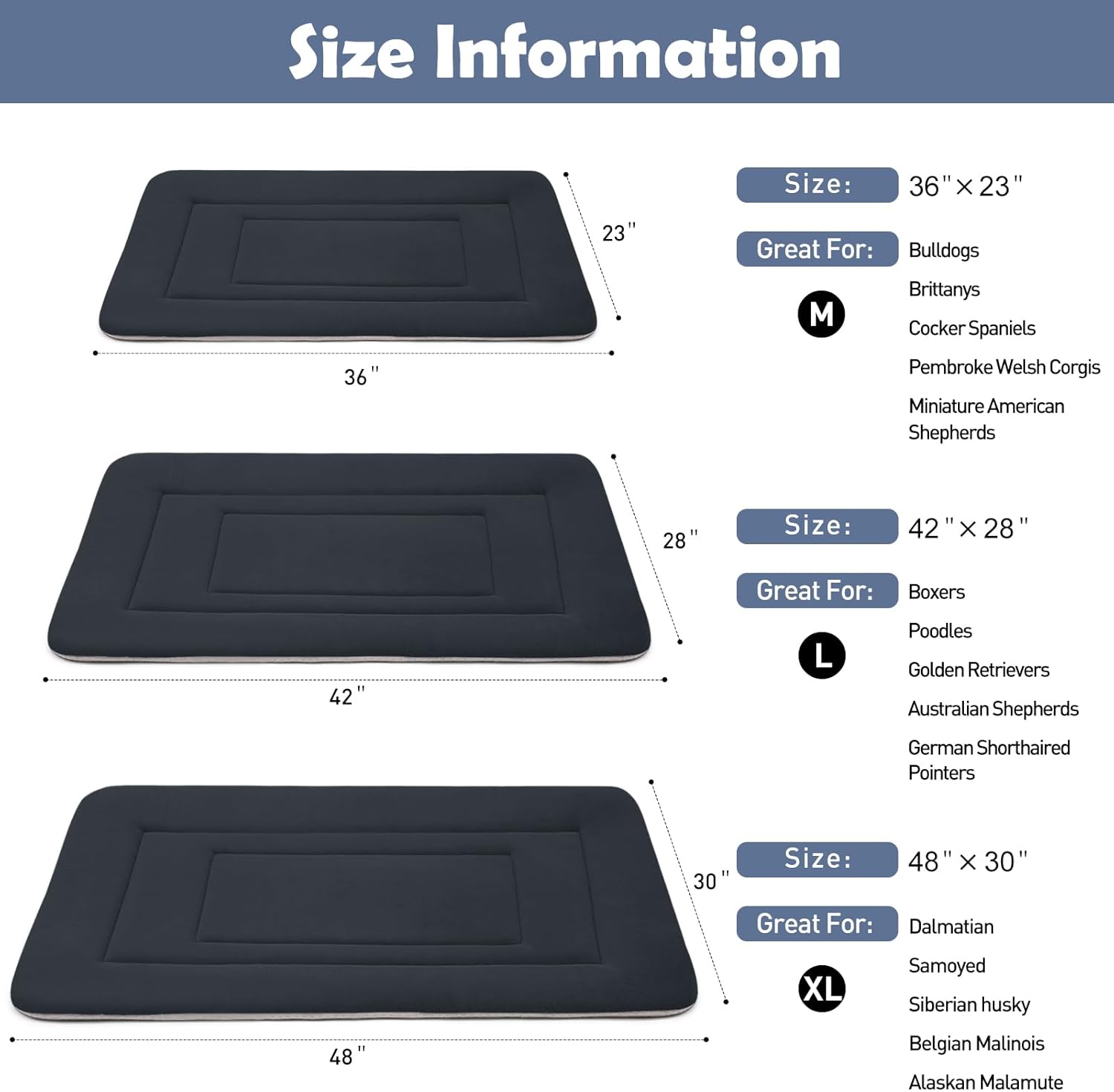 • Pet Beds Size Information: 36 (36 x 23 inch) , 42 (42 x 28 inch) , 48 (48 x 30 inch), perfectly for all size dogs