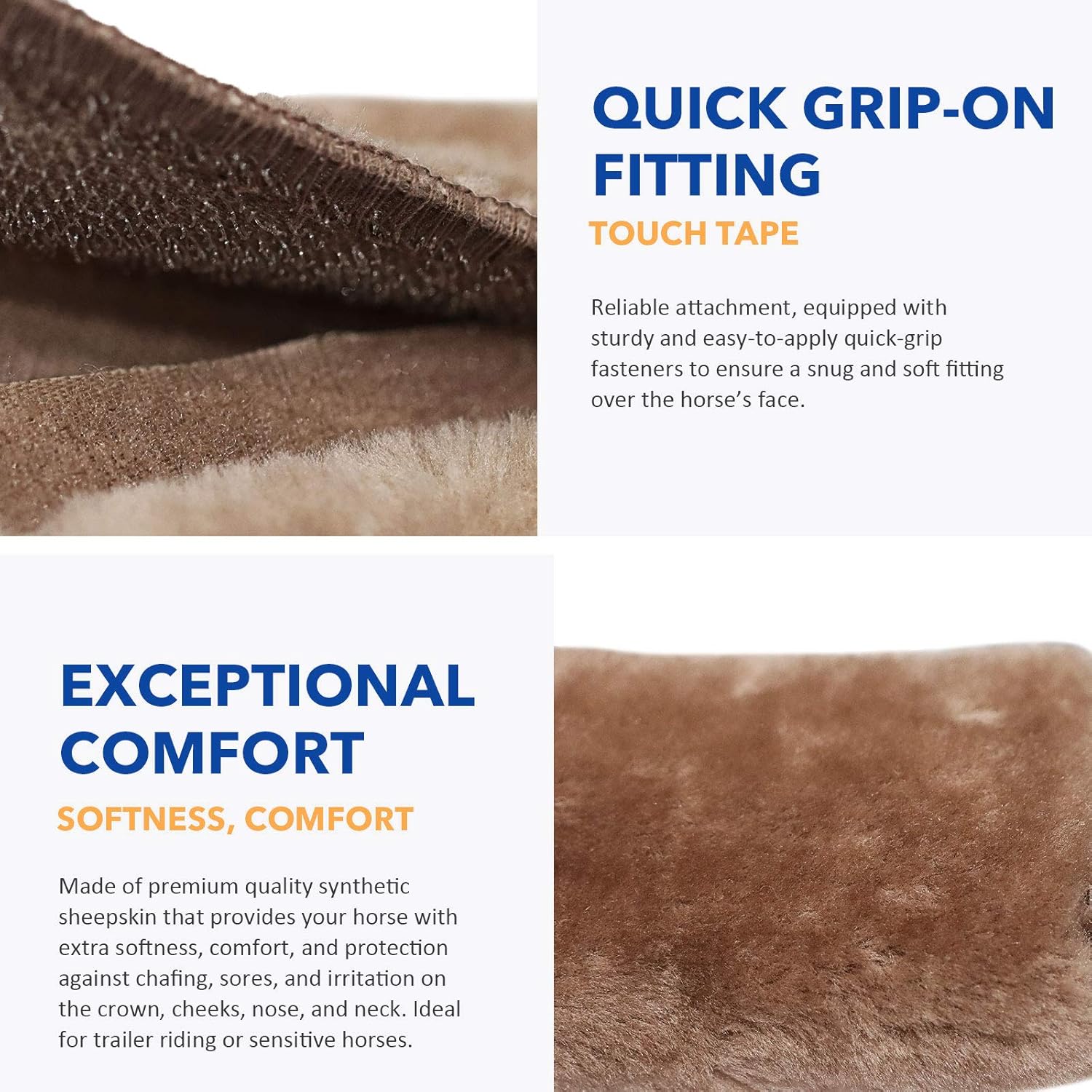 - QUICK GRIP-ON FITTING: Reliable attachment, equipped with sturdy and easy-to-apply quick-grip fasteners to ensure a snug and soft fitting over the horse’s face.