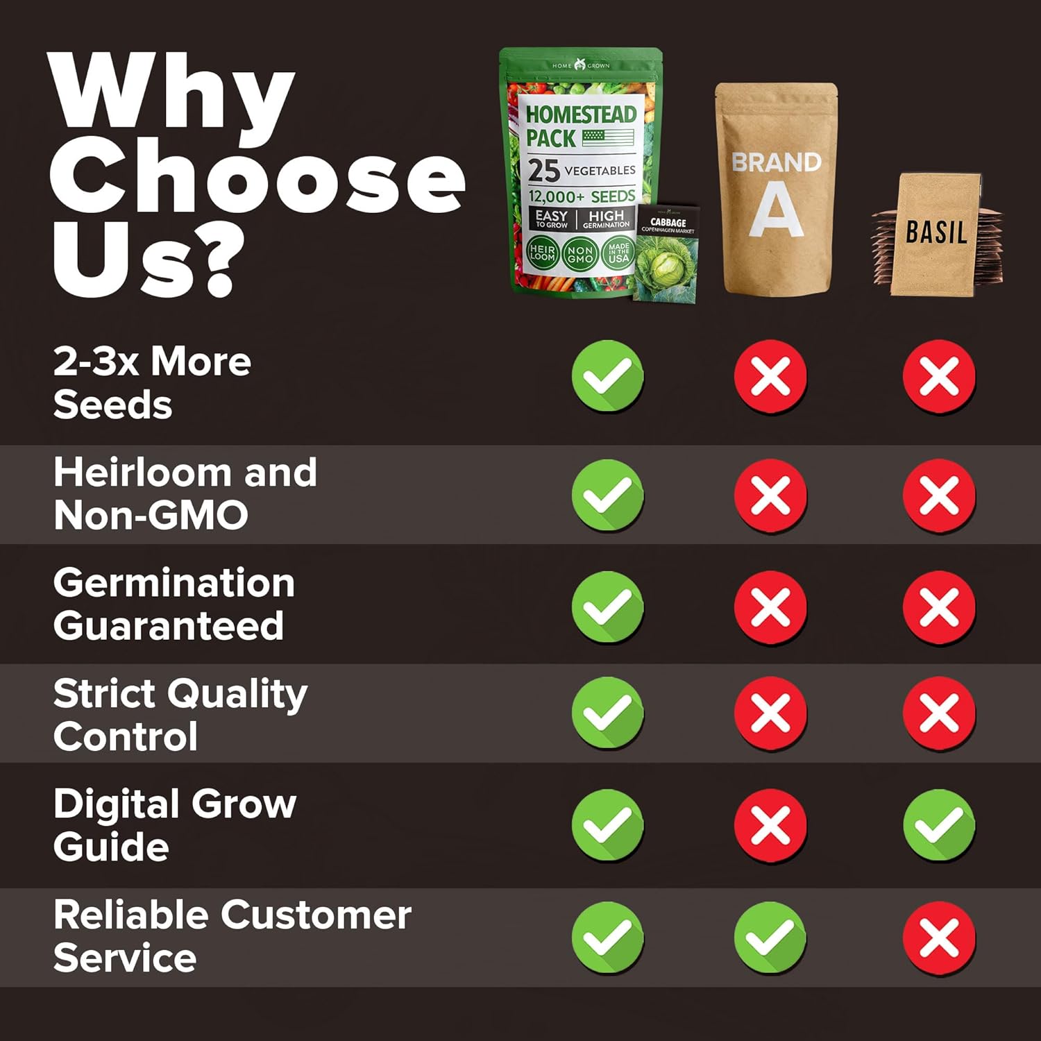 - 25 HEIRLOOM VARIETIES AND 12,000+ SEEDS FOR YEAR-ROUND HARVESTS. This comprehensive seed collection includes 25 traditional varieties and 12,000+ non-GMO seeds—offering a continuous supply of robust, hardy vegetables that thrive in both hot and cold climates. Each variety was chosen for its flavor, productivity, resilience, resistance, growth cycle, and nutritional profile.