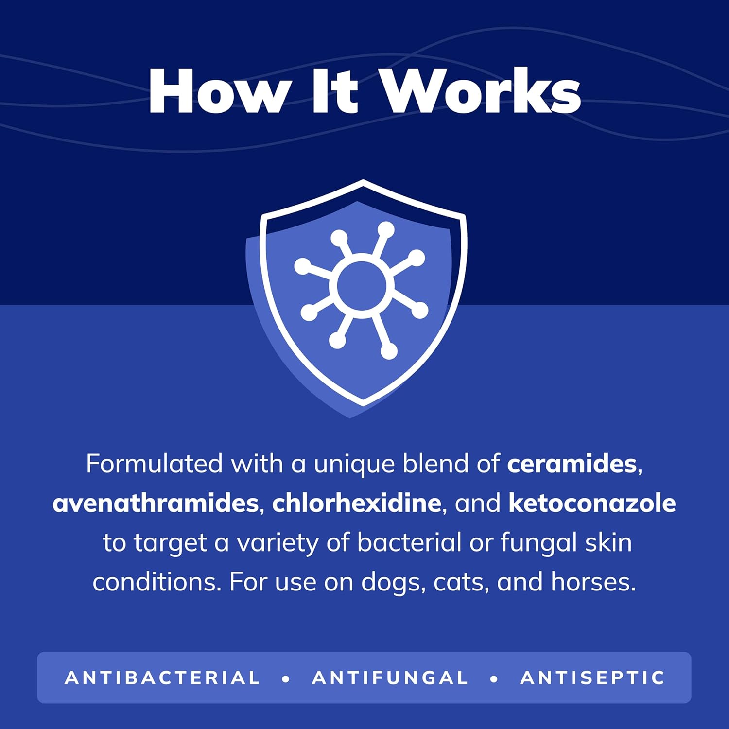 - 𝗛𝗲𝗹𝗽𝘀 𝗠𝗮𝗻𝗮𝗴𝗲 𝗦𝗸𝗶𝗻 𝗜𝗻𝗳𝗲𝗰𝘁𝗶𝗼𝗻𝘀 – This gentle yet effective shampoo is medicated with chlorhexidine 2% and ketoconazole 1% to target bacteria, fungi, and yeast.