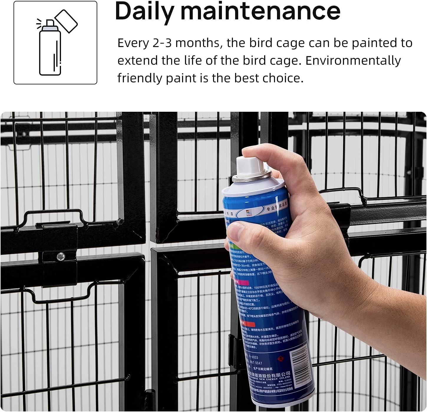 - Security - Welded stainless steel coated with a non-toxic powdered finish avoids birds' chewing & Suitable bar space prevents the risk of bird’s escaping.