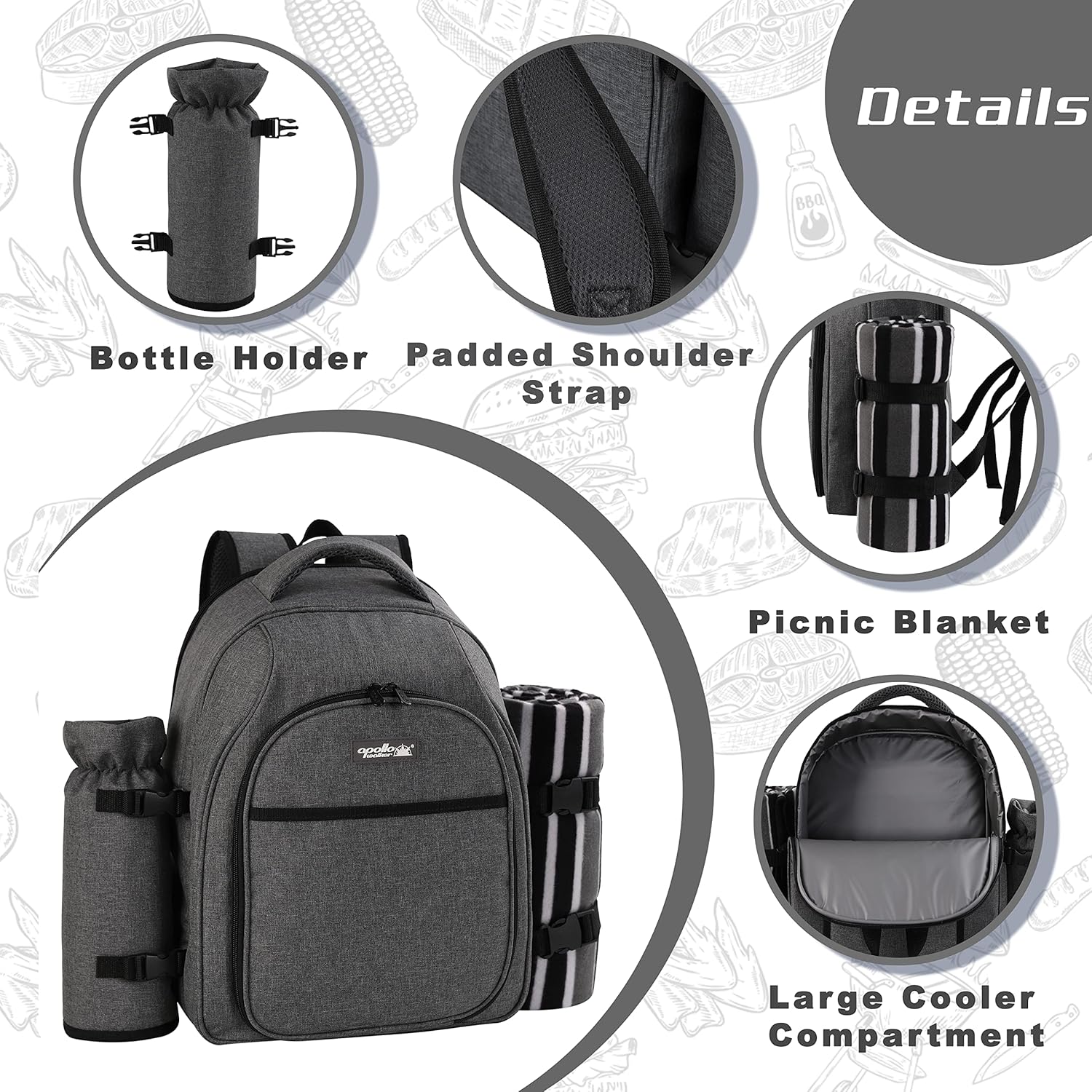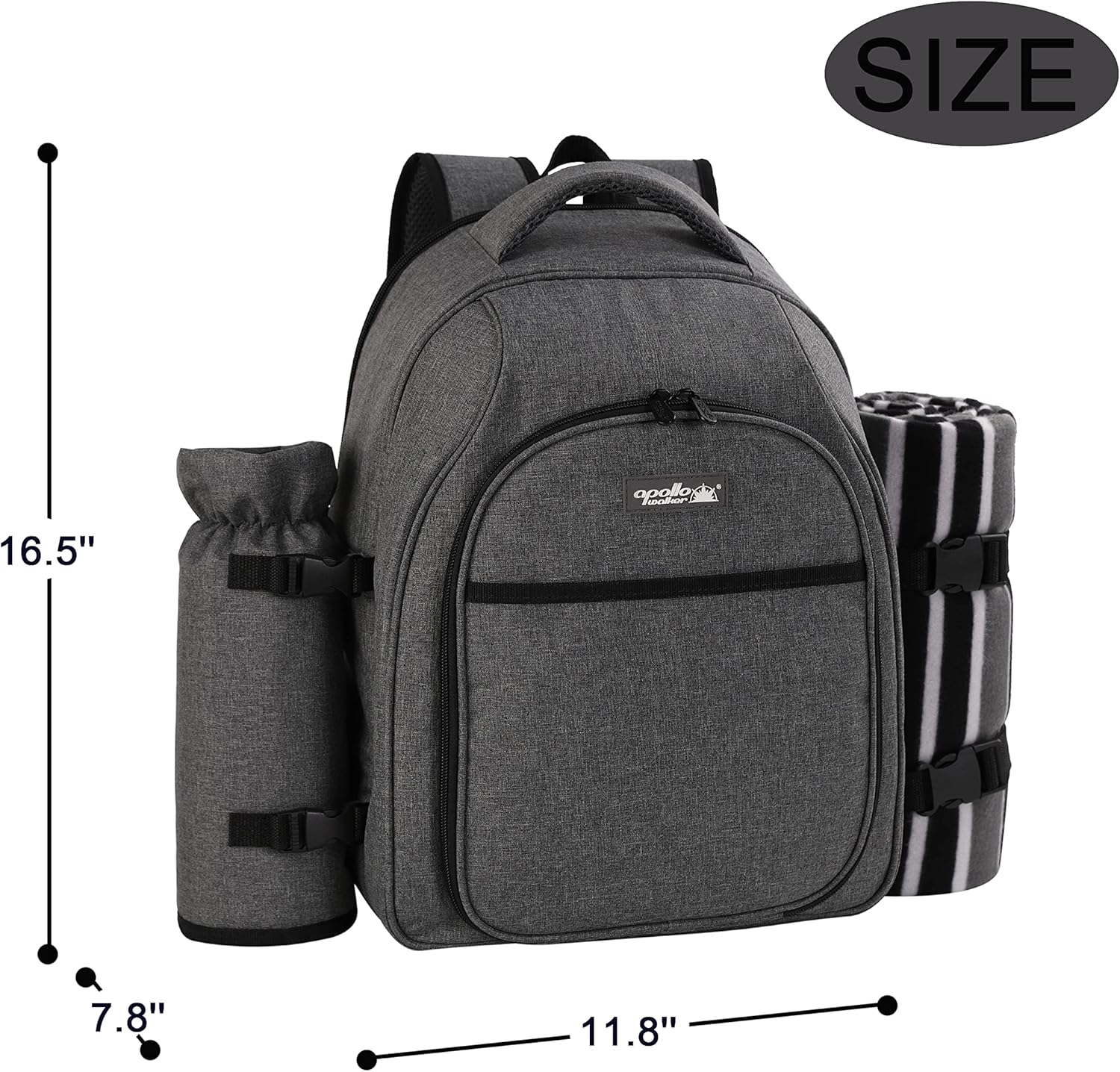 - Features a detachable insulated bottle/wine holder and a fleece picnic blanket (45x53 inches) with waterproof backing.
