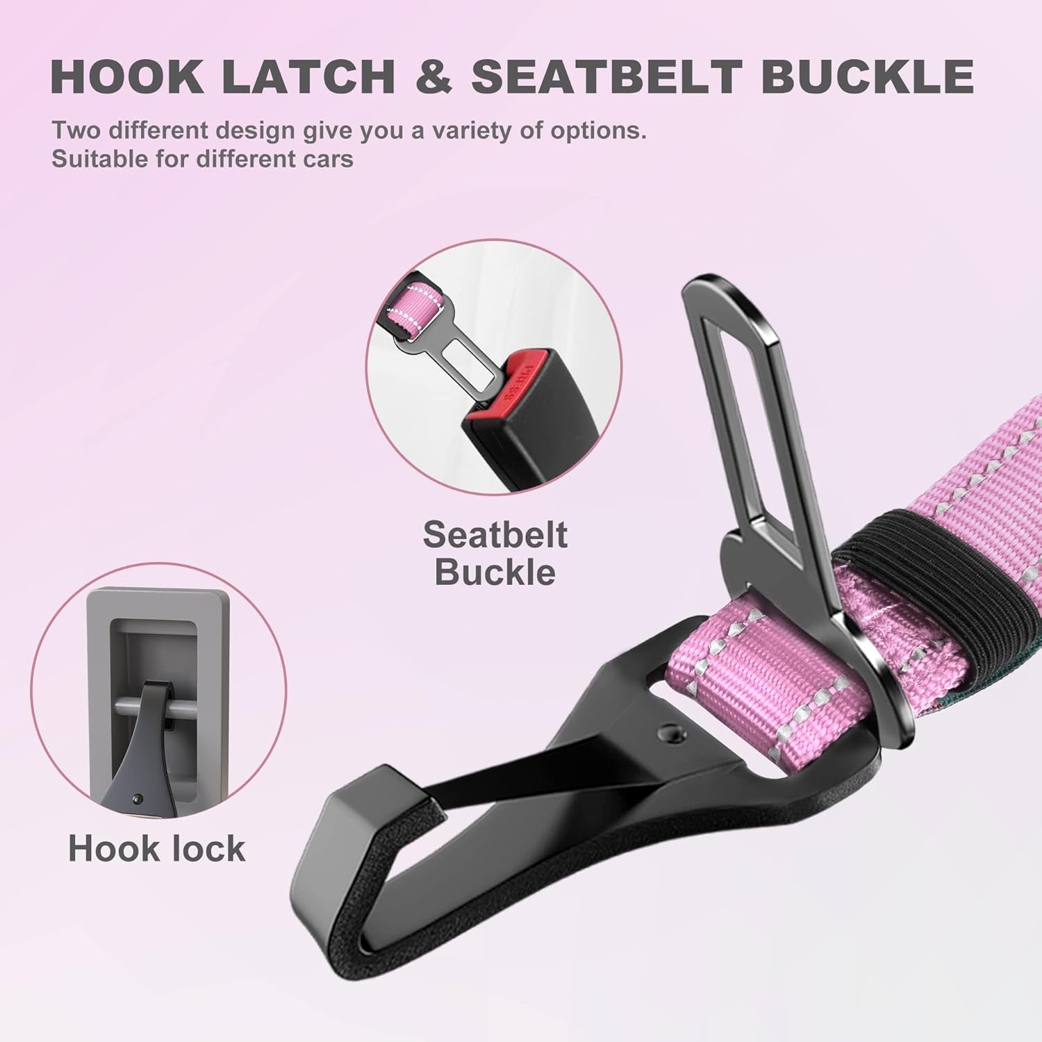 - ◆◇3-in-1 Multi-Function Seatbelt: Our dogs seat belt equipped with 2 different types of car buckles, one of which can be attached to the seatbelt buckle, and the other metal hook latch for connecting the child safety seat and the car trunk, it can be suitable for most of regular and premium vehicles. You can freely choose the connection location as needed.Dog car harness restraints seat belt suitable for front seat,Back seat and Trunk.
