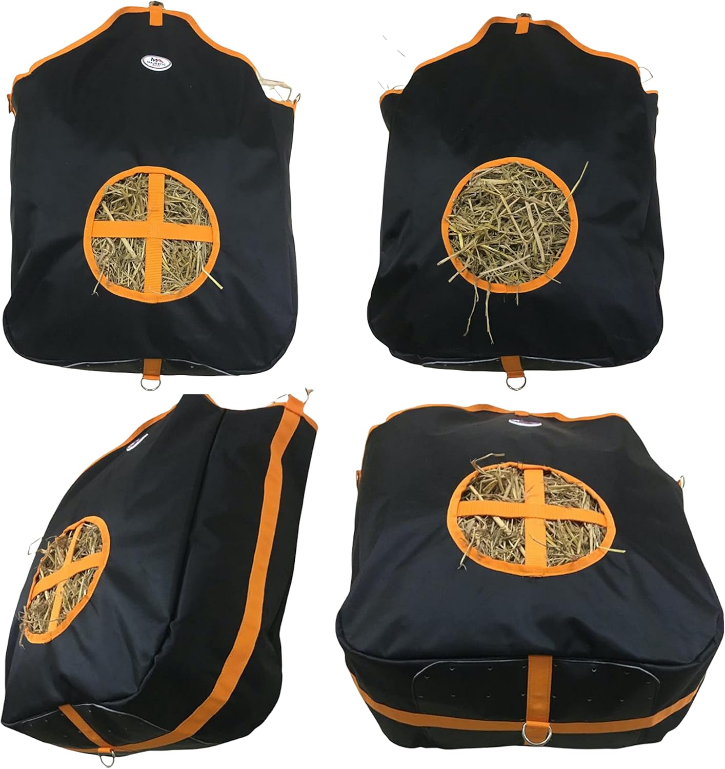 • We use a heavy-duty 1000 D Nylon with ultra-strong stitching for durability, faux leather over nylon fabric on bottom provides extra strength and ventilation and to keep to your Hay dry.