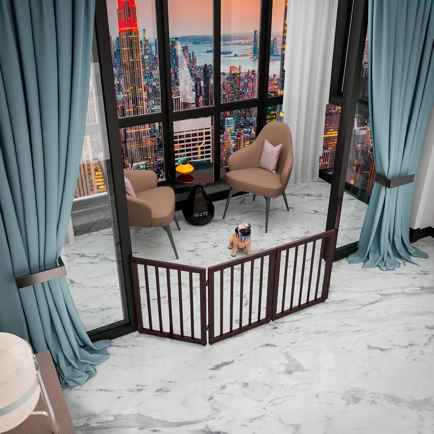 - STYLISH INDOOR DOG GATE FREESTANDING:Made of high quality MDF, the folding dog gate has a sleek modern style and a chic brown finish that is sure to complement any decor. this stylish pet gates for dogs will block kitchen doorways, bedroom doorways, front doorways, hallways and staircases in your home and looks great with your modern home furniture