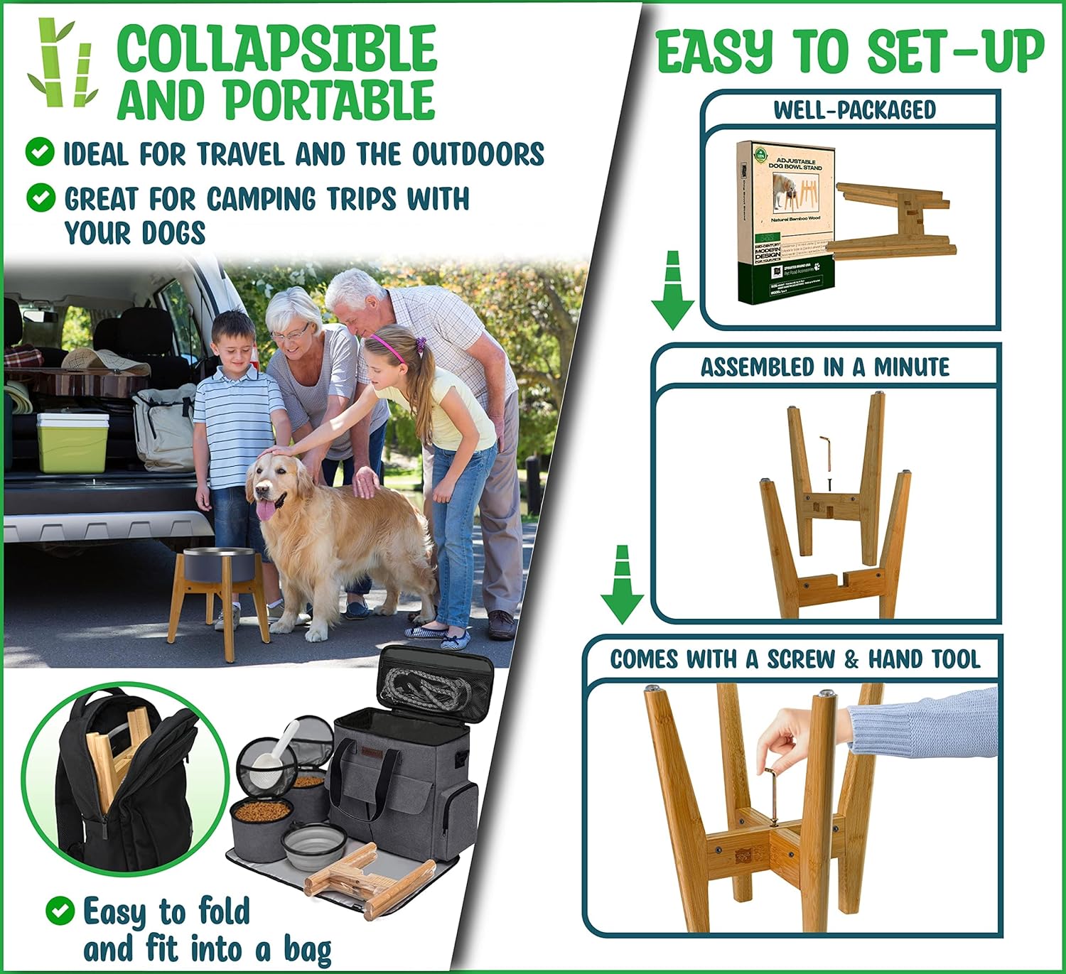 - Raises Dog Bowl Up to 15-inch – When a bowl is placed on this bamboo stand, the height of the bowl rim will become more or less 15 inches high from the ground. Please see photos. Ideal for feeding with any dog food bowl, or dog water bowl for large breeds. [Note: Bowls shown in the photos are sold separately].