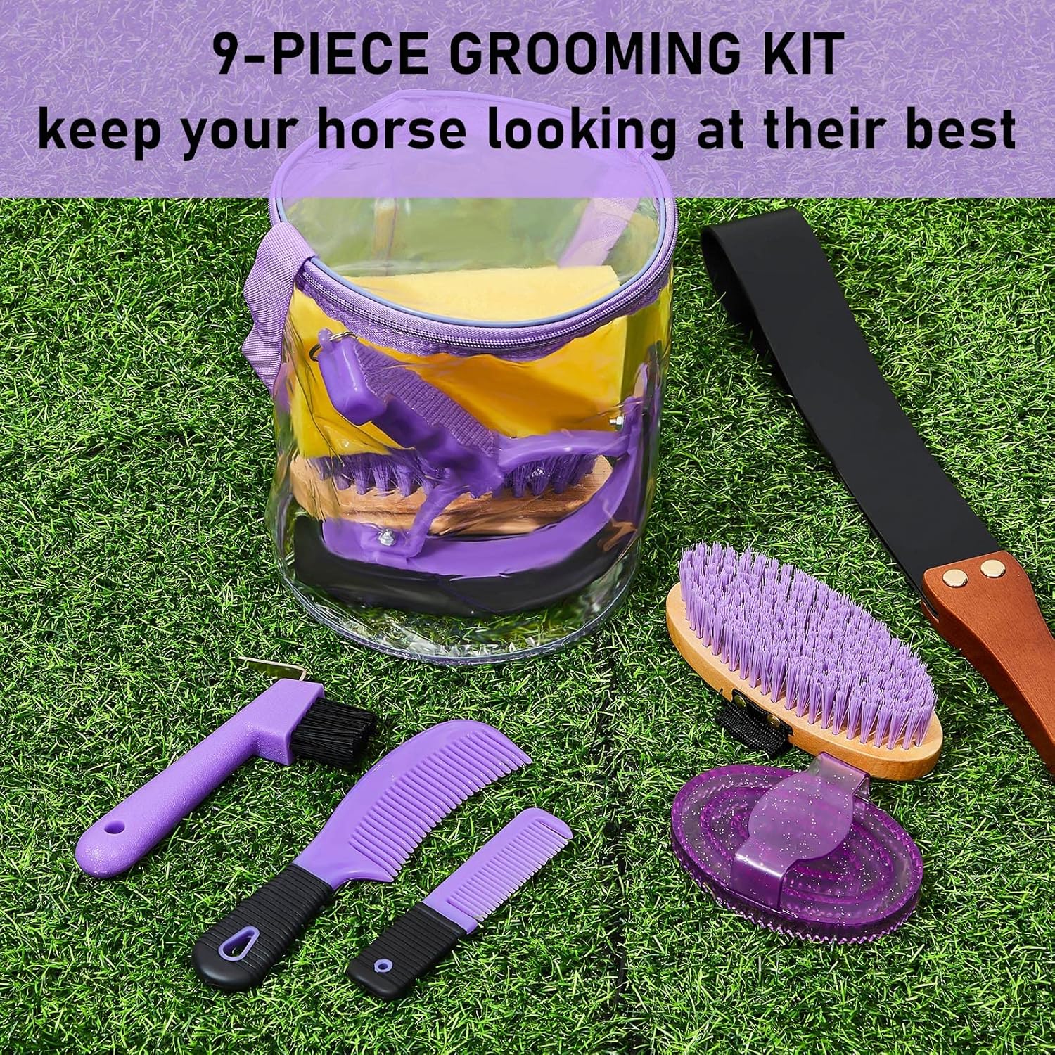 - Product Information: the horse grooming kit, includes a horse grooming tote bag, a oval massage curry, a hard brush, a soft brush, a sweat scraper, bathing sponge, a hoof pick with brush, a mane comb and a tail comb, a total of 9 pieces