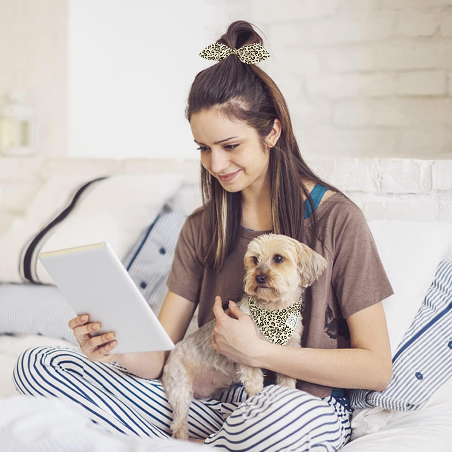- Matching Bandana and Scrunchie Set- It’s full of love when your pets is wearing the animal print dog scarf and you are wearing the headband. When traveling, sleeping, taking photos or daily walking, adorable cheetah print puppy bandana and scrunchie is a pretty daily accessories. The scrunchie can be worn as a wrist accessory, and as a hairband to hold your hair. Beautiful bohemian dog bandana matching human scrunchies with brown, black and beige print pattern, it’s nice photo props.