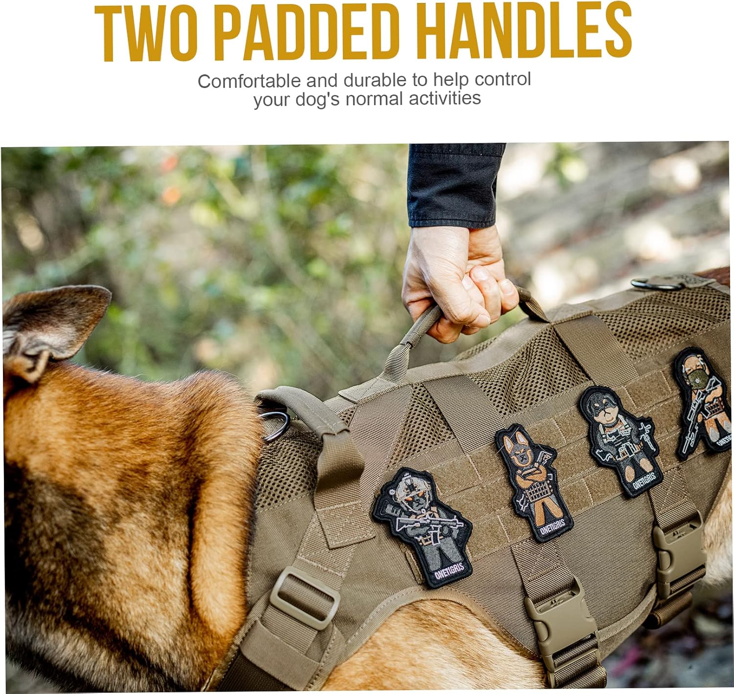 - [Molle/Handles]: Looped MOLLE panel on both sides for MOLLE compatible add-ons such as treat totes, poop bag pouches, service dog kits, military patches and name tags. 2 padded grab handles with reinforced stitchin. Useful for getting in/out of a car, immediate canine control in crowded areas or with other dogs, etc.