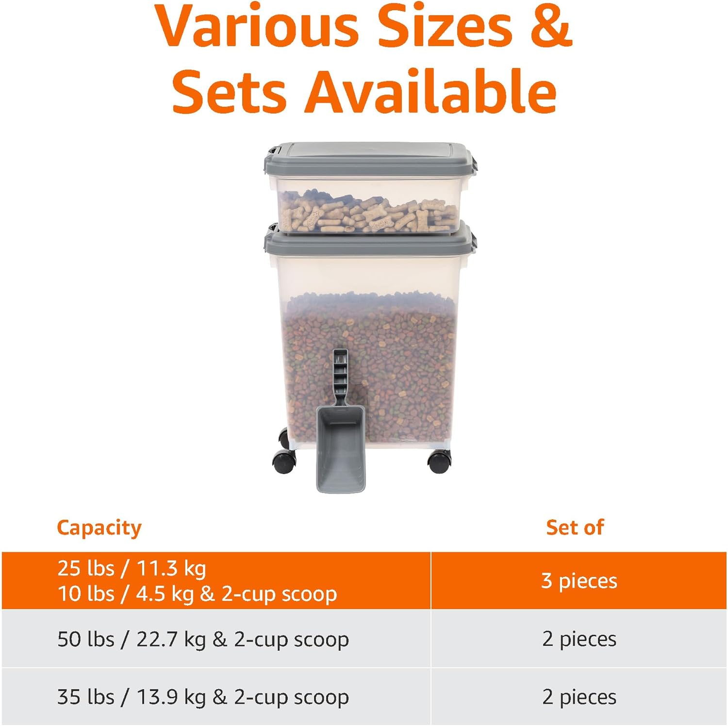 - Includes a 33 quart (25 pound capacity) container, a 12 quart (10 pound capacity) container, and a 2 cup food scoop