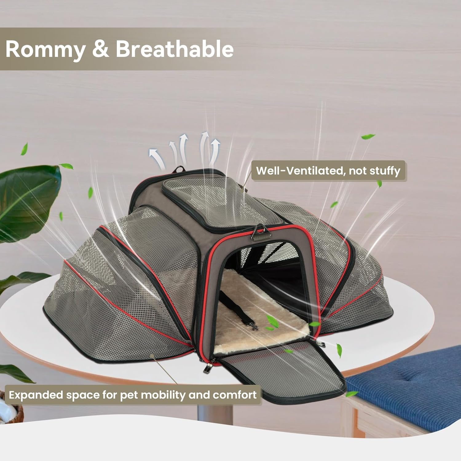 - 【COMFORTABLE SPACE】The pet carrier extra extended space enable pets sprawl out, lay, see all around and relax when you have a airline trip/car travel/long travel/vacation/leisure, also works great in the car, roomy and they lay in it like a bed. Carrier can be folded totally flat when not in use.