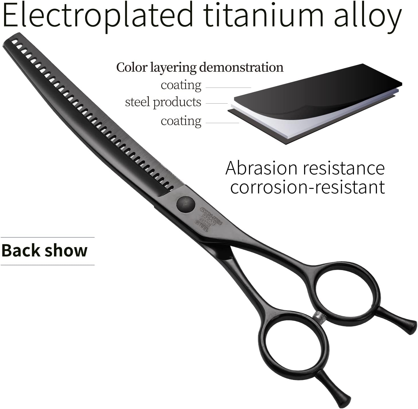 - ✂️440C Steel & Ultra Quality - The steel quality and the fine craftsmanship it is executed are the main factors defining the hardness, sharpness, and sharpness resistance, but also the shiny and professional look of the chunker scissors. Therefore, the dog grooming scissors are made of the highest quality 440C stainless steel, containing the best quality pure metals, with the greatest resistance, hardness, and wear resistance from all the stainless alloys.