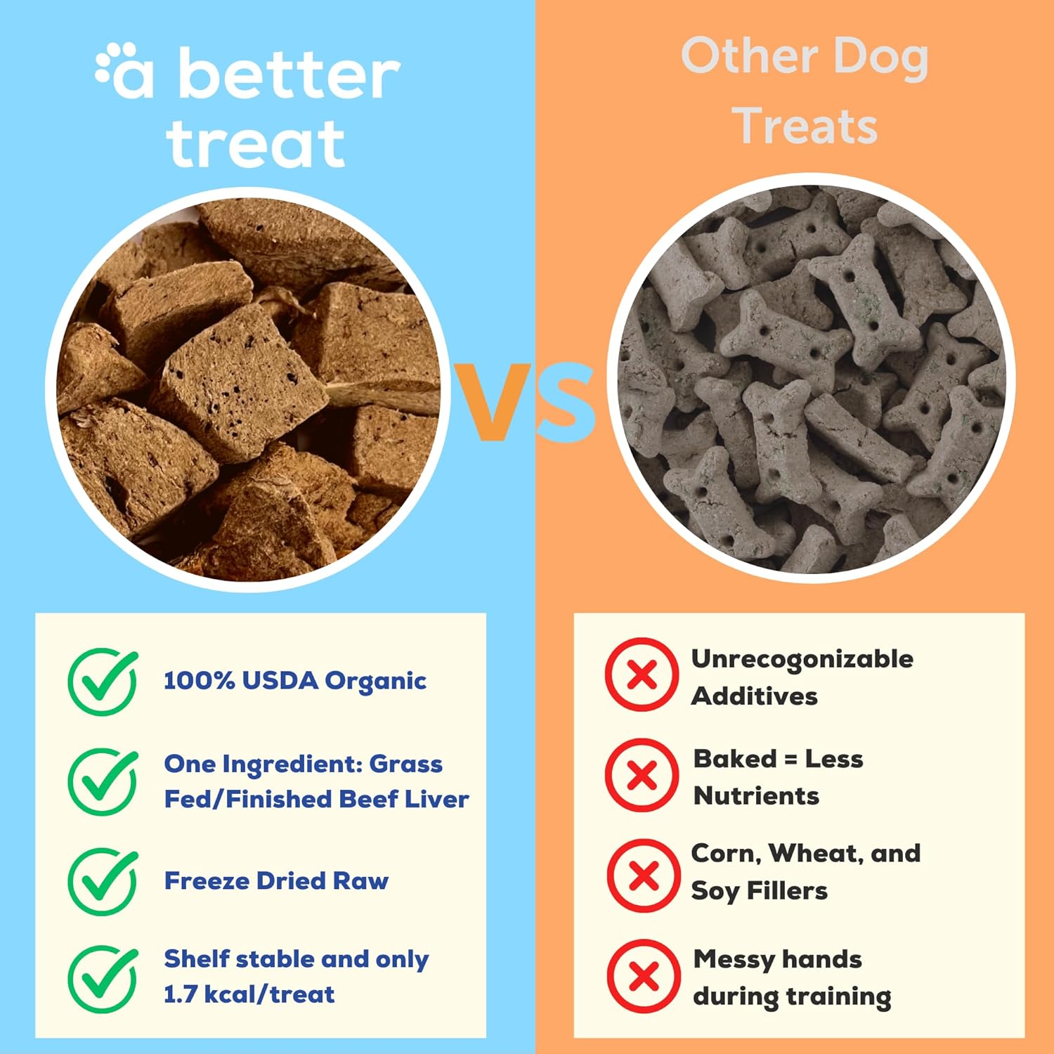 - THE FIRST ORGANIC SINGLE INGREDIENT TREATS – Our line of organic treats are the first single ingredient organic treats on the market. Organic beef liver is a great high value treat, stomach soothing, and is packed with protein. They are non-greasy – perfect for training, as a food topper, or simply a heavenly reward.