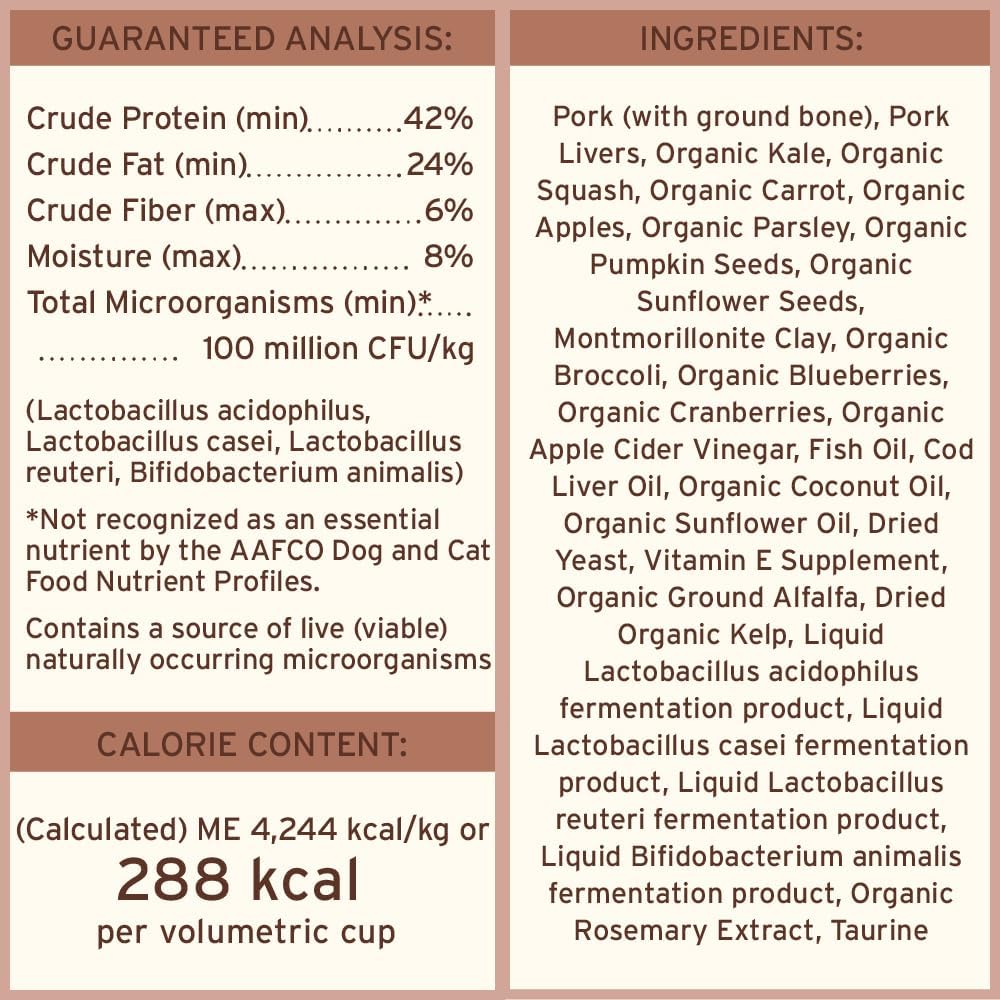 • Premium freeze dried raw dog food made with crate-free pork, raised without antibiotics, steroids or added hormones and with USDA certified organic fruits and vegetables. Grain free