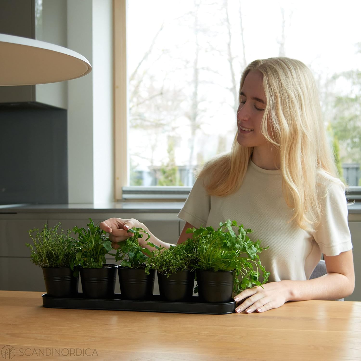 - STURDY AND STRONG - Made from the painted high quality steel. The oval tray keeps the herbs pots attractively corralled and easily transportable. Window sill herb garden tray dimensions: 19.5” L x 1.1” H x 3.5” W — Pots: 3.9” high, 3.9” top width, 3.1” bottom width