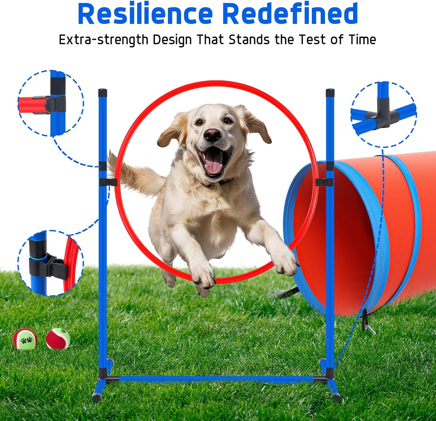 - [Diversified Agility Training Equipment Sets] We have prepared the most complete training set for you:height adjustable jumping ring and extra large version of hurdle jump made of high quality PVC material,no need to worry about the pole will be bent or damaged.The jumping height can be adjusted by the activity clip to set different difficulties and improve the dog's degree of agility and flexibility.Dog obstacle course backyard collapsible tunnel made of selected material prevent tear and breakage during sports practicing