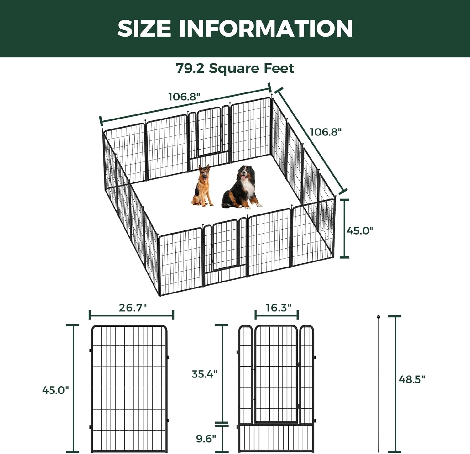 - Super easy to assemble: It won’t take you more than 5 minutes to assemble these portable dog fences as well as pack them away due to the rod-connected design. Meanwhile, panels can be added or removed freely to give you a fully flexible area and arrange the dog pen in any shape you need.