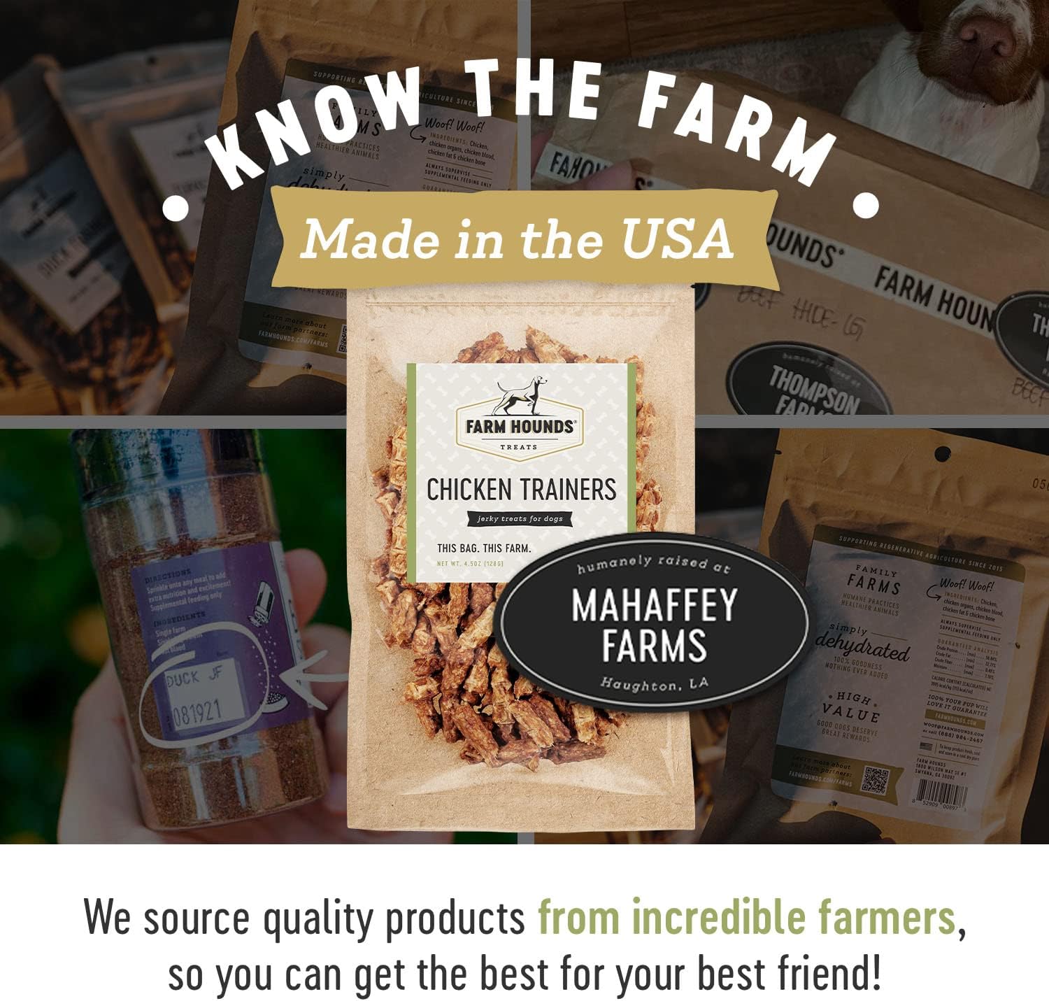 - FARM HOUNDS - At Farm Hounds, we believe healthier animals are happier animals. With your canine in mind, we make all of our treats nutritionally beneficial and delicious. Our close relationship with all-American family farmers who raise their animals in a humane way, helps us use premium raw materials for our products.