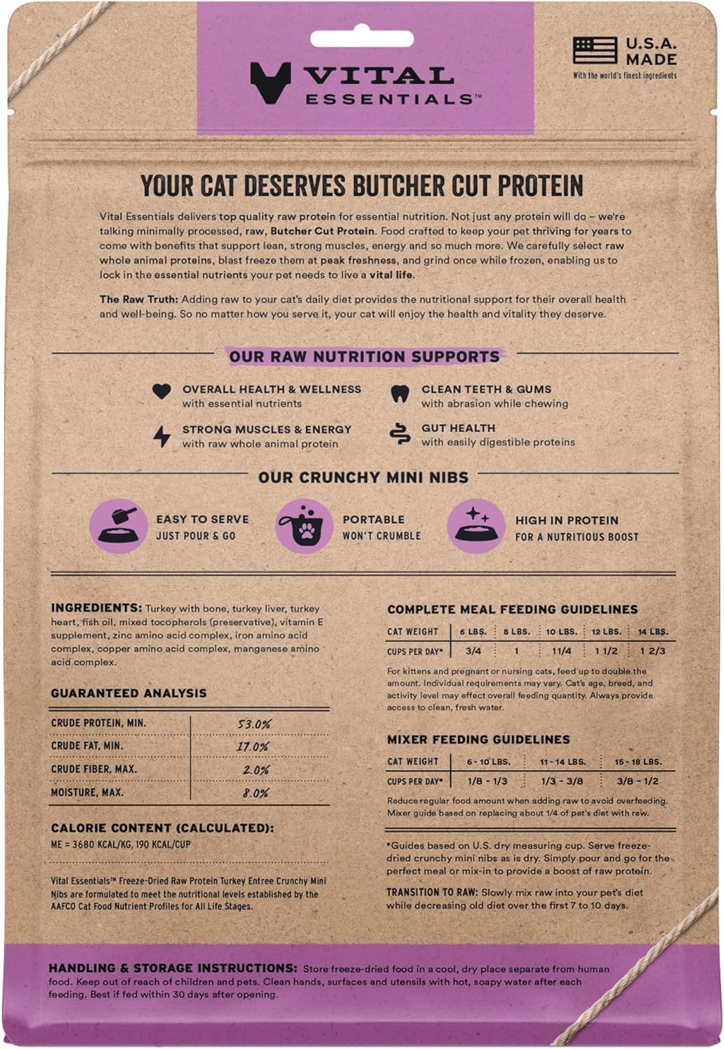• CRUNCHY FREEZE-DRIED RAW TURKEY CAT FOOD: Vital Essentials Crunchy Freeze Dried Cat Food packs more protein than industry standard into every bite to deliver the peak vitality your cat deserves, especially when compared to dehydrated cat food. This complete and balanced freeze-dried raw cat food is made with premium butcher cut turkey, responsibly sourced in the USA.