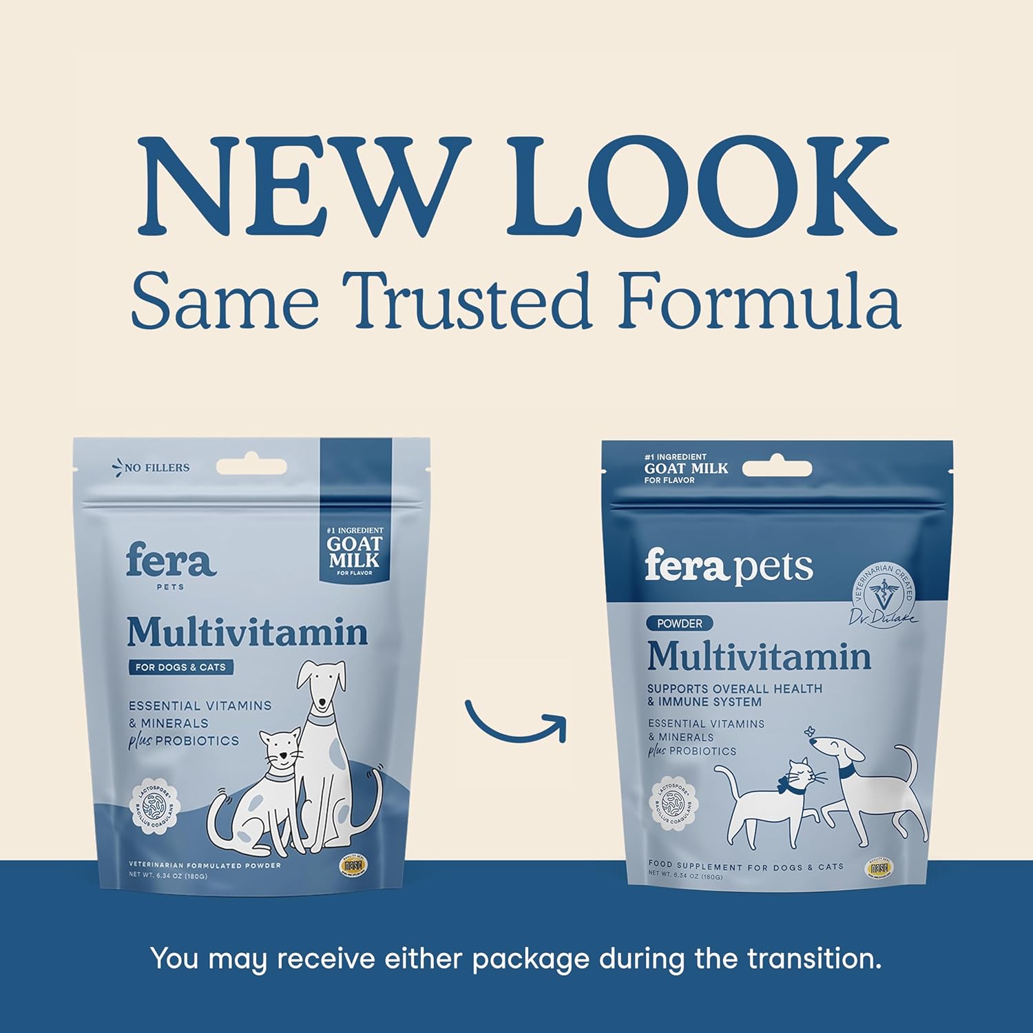 - Dog and cat vitamins: Fera’s Multivitamin goat milk contains a full range of vitamins and minerals, as well as probiotic for dogs and cats to keep your pet active and happy
