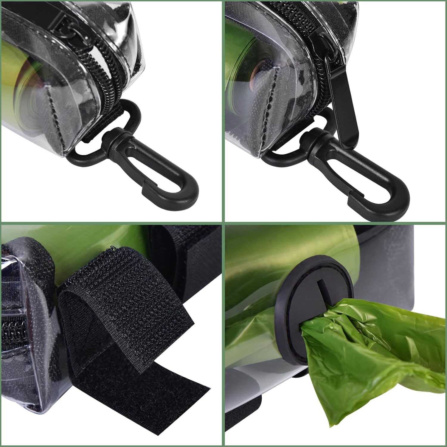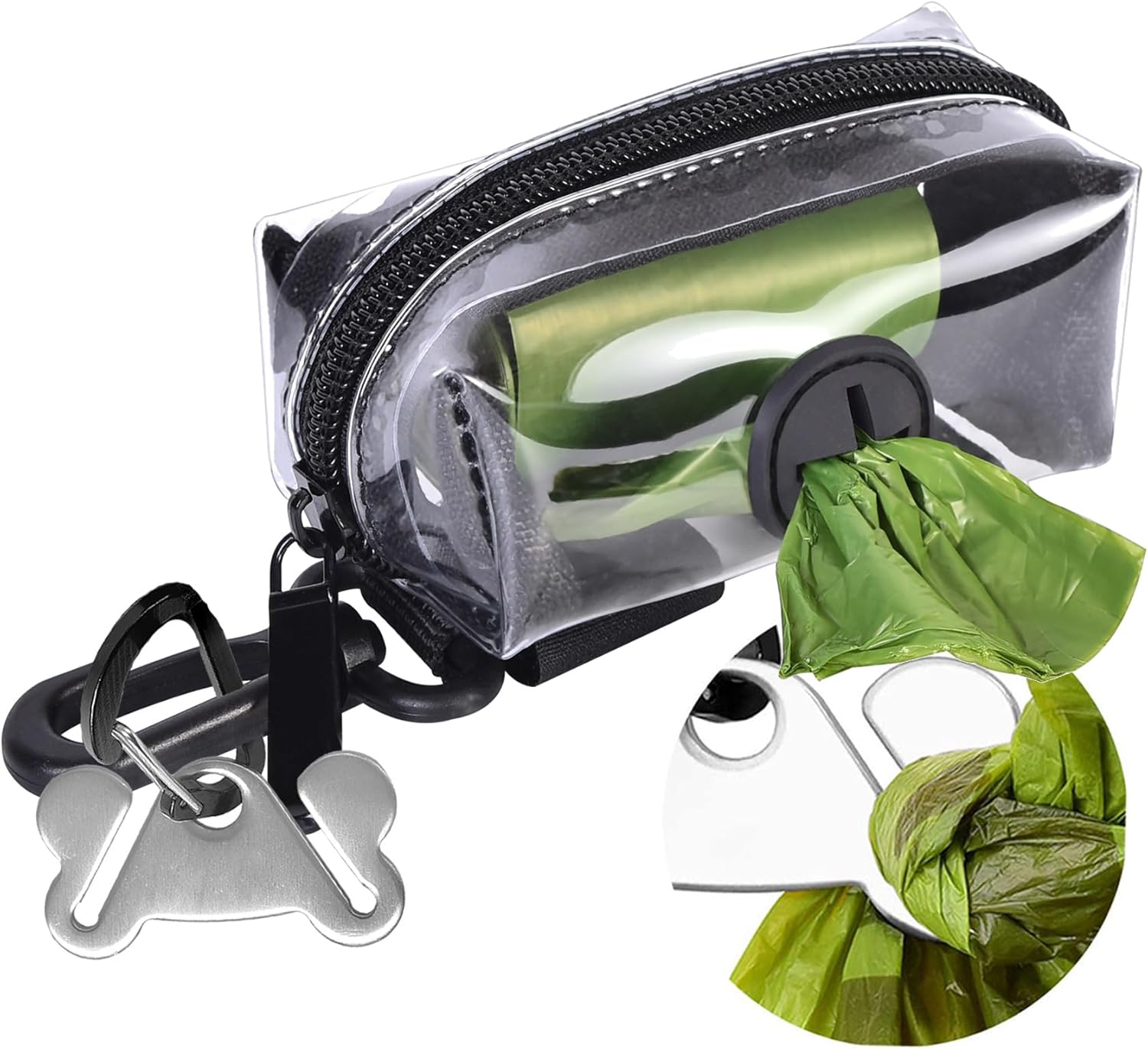 - DOG POOP BAG DISPENER SET - This set include ONE Dog Poop Bag Dispenser & ONE Hand Free Metal Dog Poop Bag Holder (Not Include the Green Waste Bag) . A new great leash attachment set for your dog walking. Enjoying hand free walking without carrying the unused dog poop bags on hand and holding wasted poop bag.