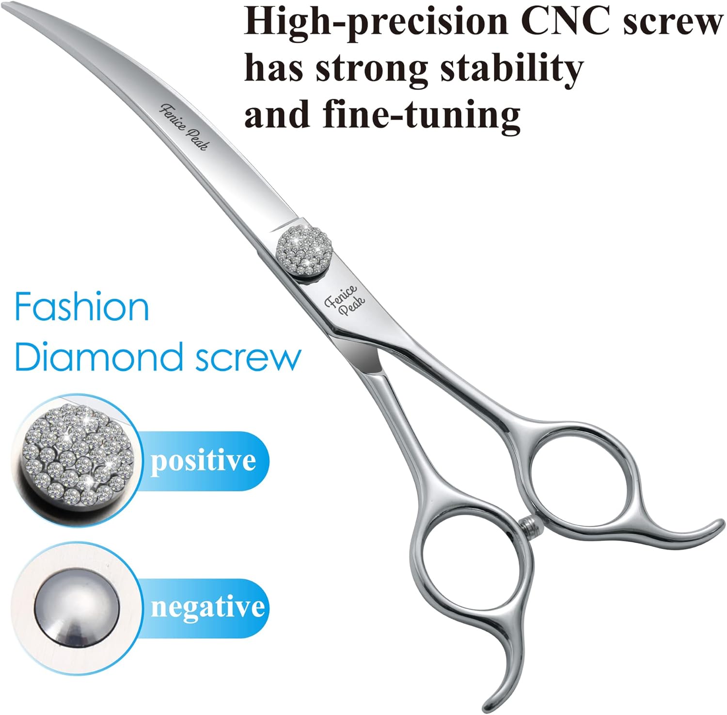 - Sharp and Fine Cut - These curved dog grooming scissors are sharpened by handicraftsmen. Experts check the scissors' sharpening one by one. Consequently, the blades of these pet grooming scissors are extremely sharp, and the cut is very fine, precise, and fast, It works very well on any type of coat, regardless of whether it is thick, wiry, or curly.
