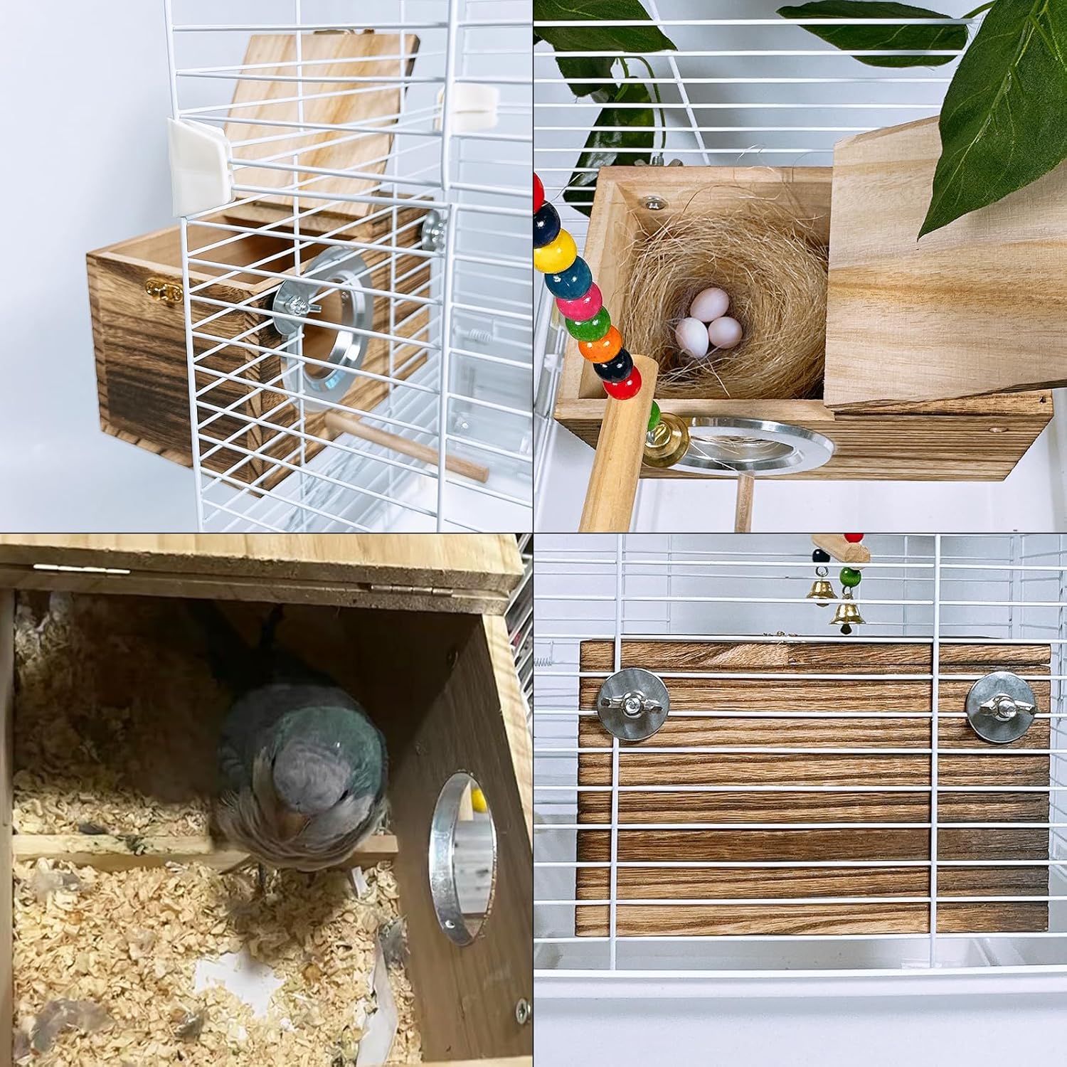 - 【Practical Design】 The parakeet parrot nest box for cages and habitats is designed with built-in partitions to prevent bird eggs from rolling. The metal components are electroplated to prevent rusting. The smooth round entrance allows your bird to enter and exit easily without injury. The perch at the entrance facilitates birds entering the nesting box while also satisfying the parrot's habit of perching on the shelf.