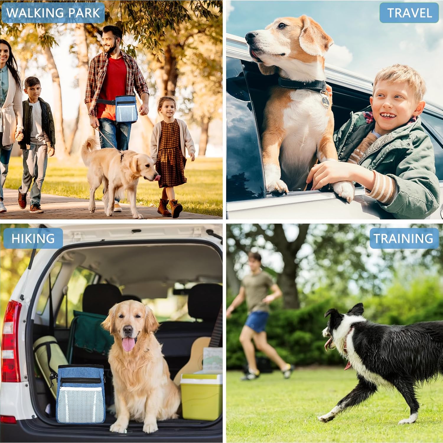 • Multi-Function Treat Pouches for Pet Training — The dog treat pouch can easily store kibble, toys, treats, poop bag and your personal belongings, such as phone, keys, wallet and so on. The D-rings can be used to hang dog clicker training kit or dog cups. The dog treat pouch keeps your hands free. Perfect for dog training at the park!