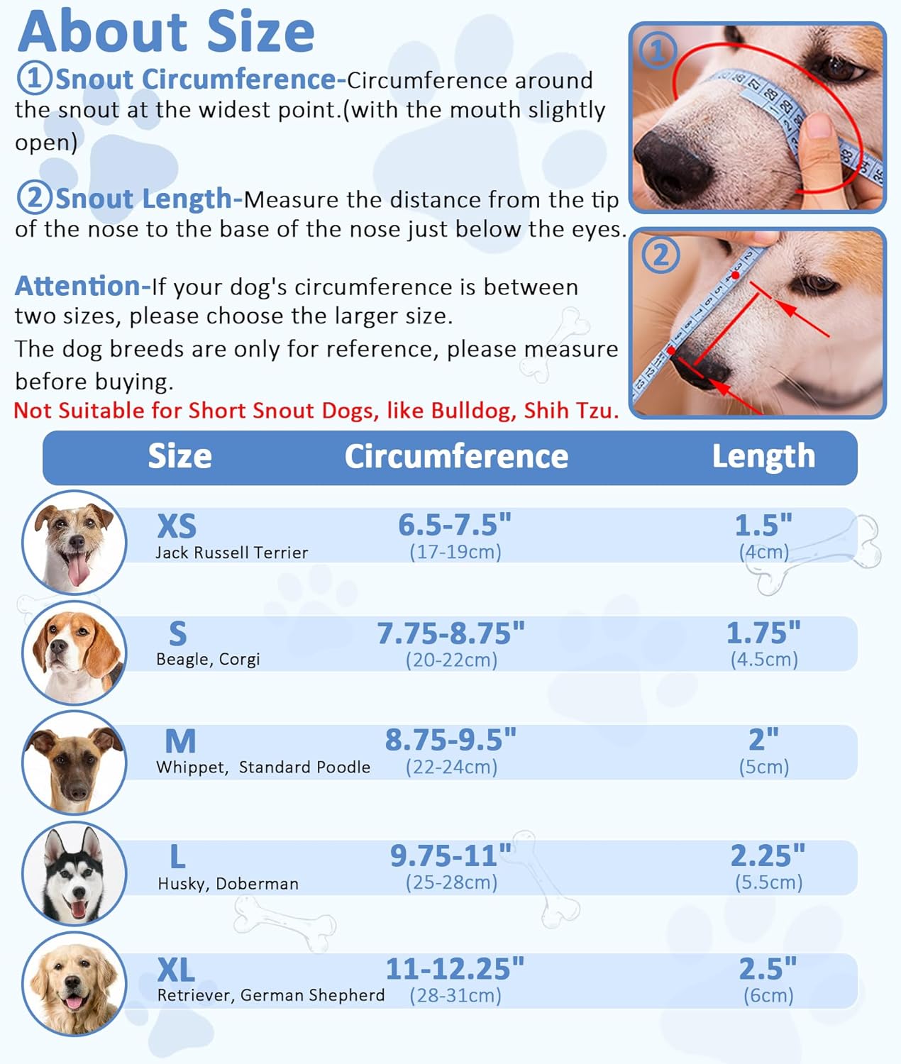 - Dog Muzzle for Small Dogs: Size S fits for dogs with snout circumference between 7.75"-8.75", and snout length longer than 1.75". The dog muzzle is suitable for Beagles, Corgi, etc. Note: ①Measure your dog's snout datas as shown in the size chart or the video before choosing the size(The snout circumference is the key to choose sizes). ②If between sizes, SIZE UP! ③Not suitable for aggressive dogs, highly anxious dogs, short-snout dogs, flat face dogs