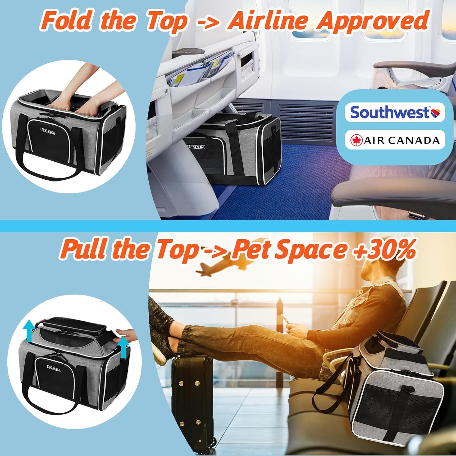- 【AIRLINE APPROVED CARRIER 】Unfolded size:18"L×13"W×(9.5+3.5)"H, Petskd pet carrier is TSA approved and can be placed under the seat in the cabin, it is mainly designed for ①Southwest Airlines:18.5x13.5x9.5", but also in compliance with ②Air Canada:21.5x15.5x10.5". We recommend you buy this carrier when you fly with the above-mentioned airlines.