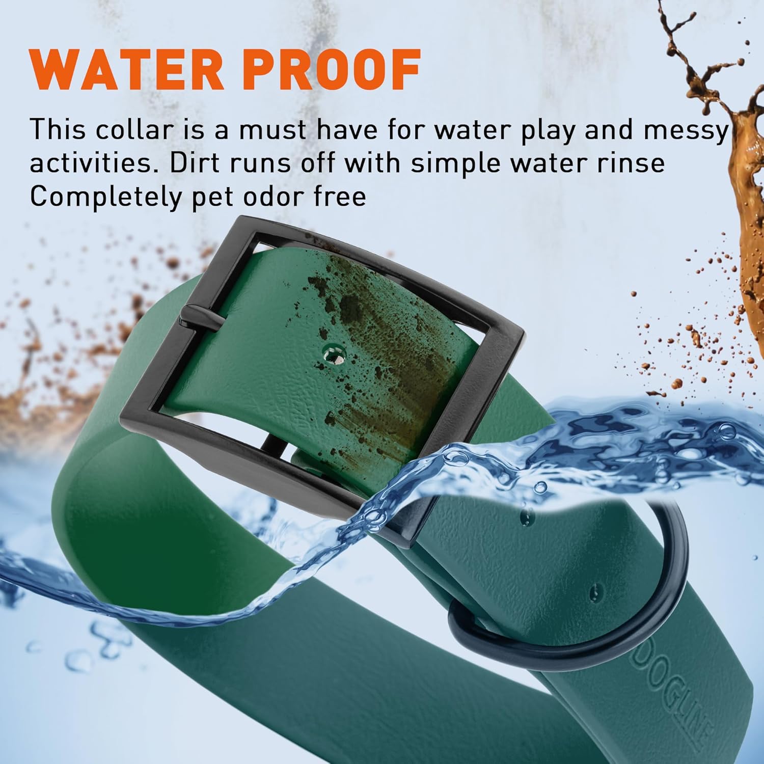 • Free Your Dog to romp in puddles and retrieve from lakes with the Dogline Biothane Waterproof Dog Collar. This water-repellent collar stays dry and odor-free, without shrinking or losing flexibility.