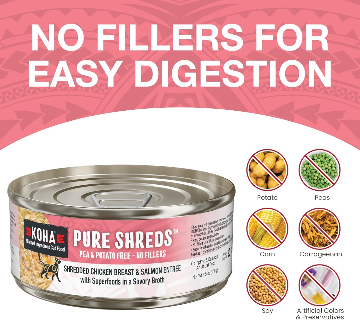 - DELICIOUS CHICKEN & SALMON CAT FOOD: This bowl flippin' good wet cat food is safe for sensitive stomachs. Pure Shreds are minimal ingredient recipes that are perfect for cats with food allergies or digestive issues.