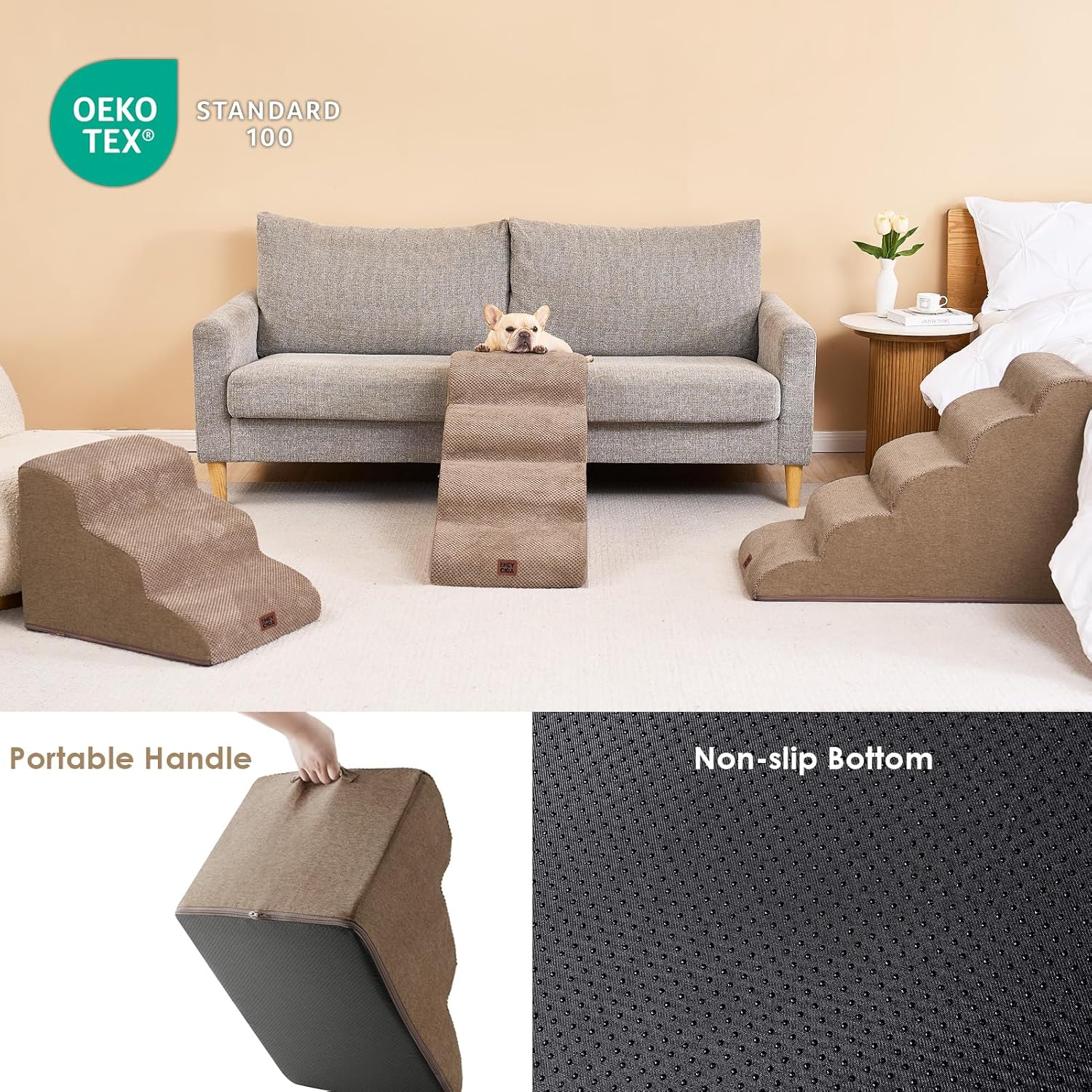 • COMFORTABLE PET STAIRS - This foam dog stair is designed directly against the edge of a bed, sofa or other furniture, so your pet can climb up and down comfortably.