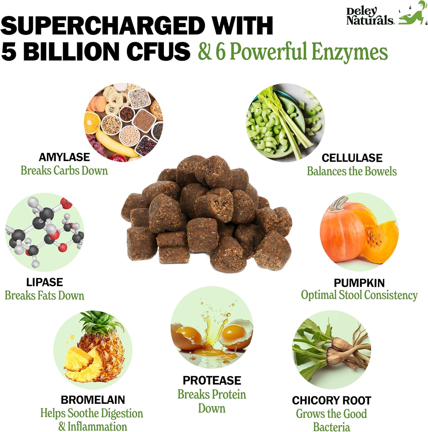 - DOG GUT HEALTH PROBIOTICS - Deley Naturals Probiotic Plus for Dogs improves gut health, irritable bowels, gas, bloating and constipation, loose stools, and anal gland issues. These soft chews can help skin and coat problems, allergies, itching, bad dog breath, which are caused by a lack of good gut health.