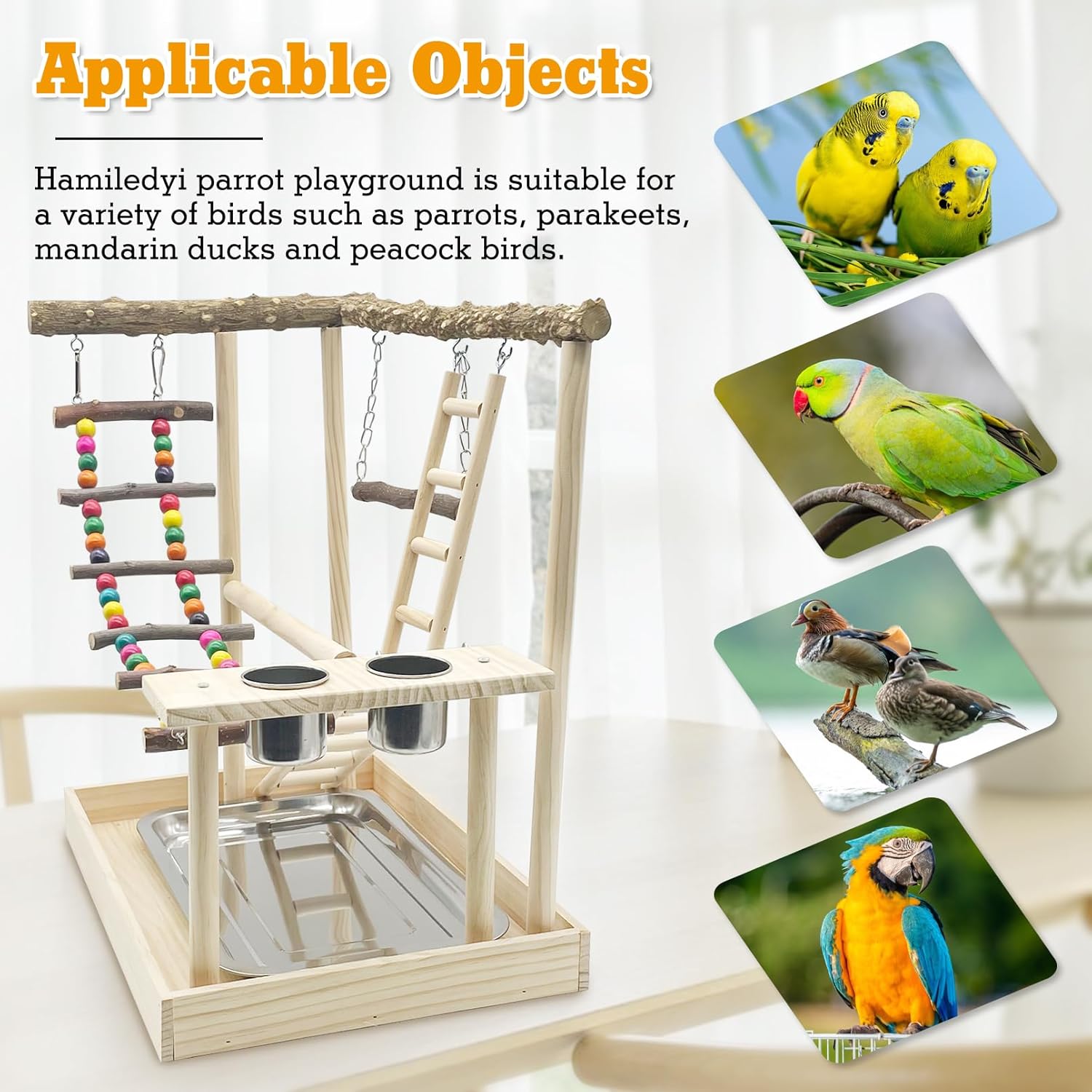 - WOODEN,STABLE,STURDY: Hamiledyi parrot playstand is made of handmade 100% natural wood. Strong, durable and bird stand perch is safe to chew, all the parts are connected with screws. This way, the bird play gym is more sturdy and more stable, and will not hurt the bird's feet. Attention Please: you need to assemble the bird stand by yourself