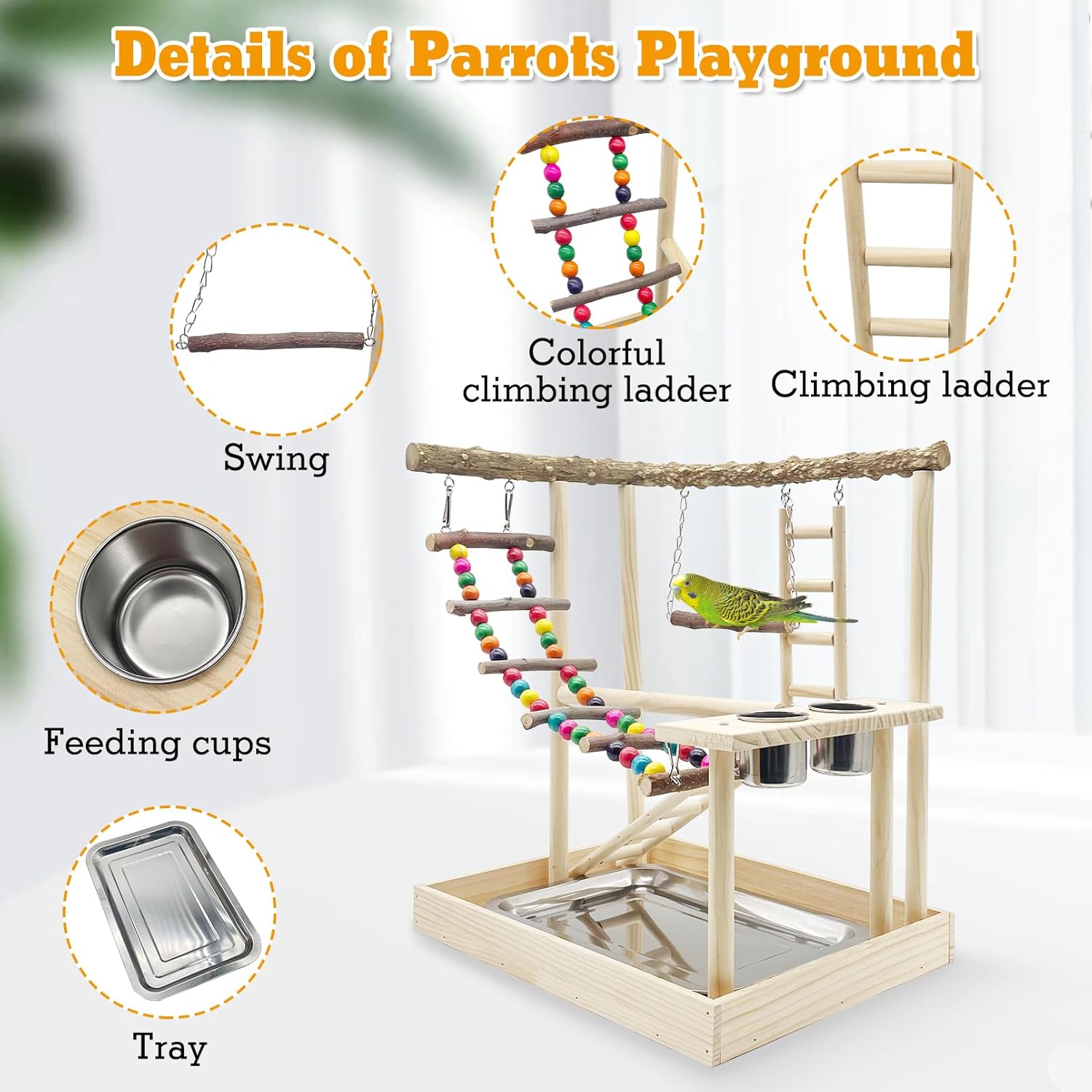 - AWESOME PLAYGYM FOR FUN: Bird play gym parakeet is great fun and provides your bird with a full range of enjoyable experiences. Bird play gym with stand conures provides a comfortable place for your pets to play and exercise, eliminat boredom and improve the level of exercise. Allows your bird to get good climbing training. Offers many perching areas and ladder for additional bird play area budgie exercise opportunities