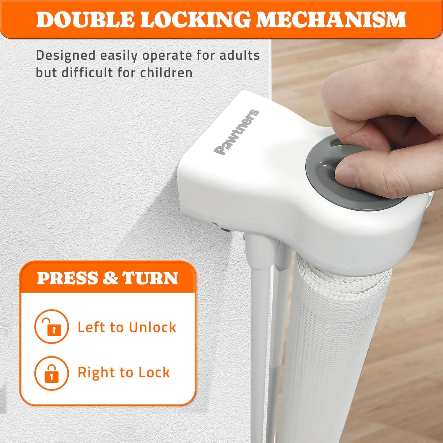 - Double Locking Mechanism: The knob (Press & Turn Design) at the top of the baby gate, especially the tall baby gate, ensures easy use for adults—open and close with one hand. Meanwhile, curious little ones won't be able to unlock this secure safety gate